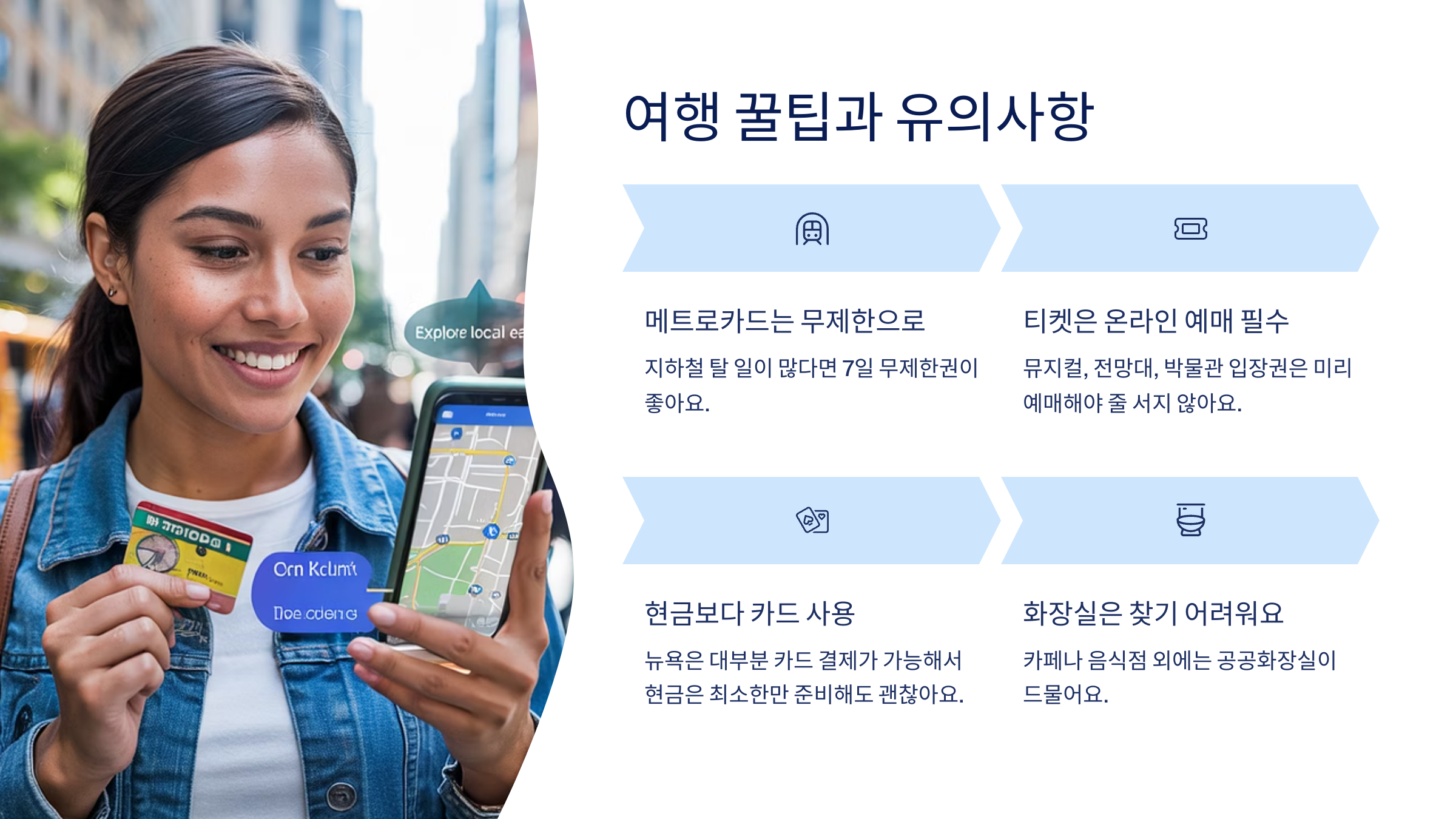 뉴욕 여행을 더 똑똑하게 즐기기 위한 꿀팁 몇 가지 알려줄게요! 단순한 정보보다, 실질적으로 도움이 되는 현실적인 팁만 쏙쏙 모았어요. 놓치지 말고 참고하면 완벽한 여행이 될 수 있어요. 😉