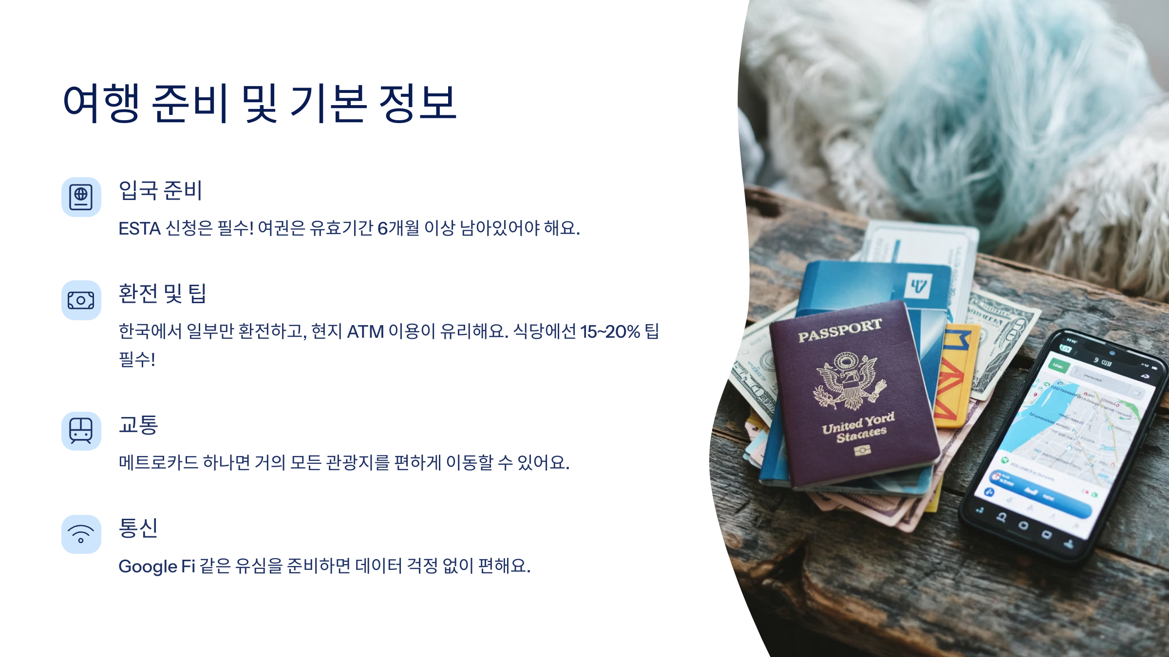 입국심사는 까다로울 수 있으니 ESTA 신청은 필수! 영어 간단 회화 몇 문장은 미리 익혀두는 게 좋아요. 환전은 한국에서 일부만 하고, 나머지는 현지 ATM에서 인출하는 게 유리할 수 있어요. 미국은 팁 문화가 있어 식당에선 15~20% 팁을 줘야 해요.