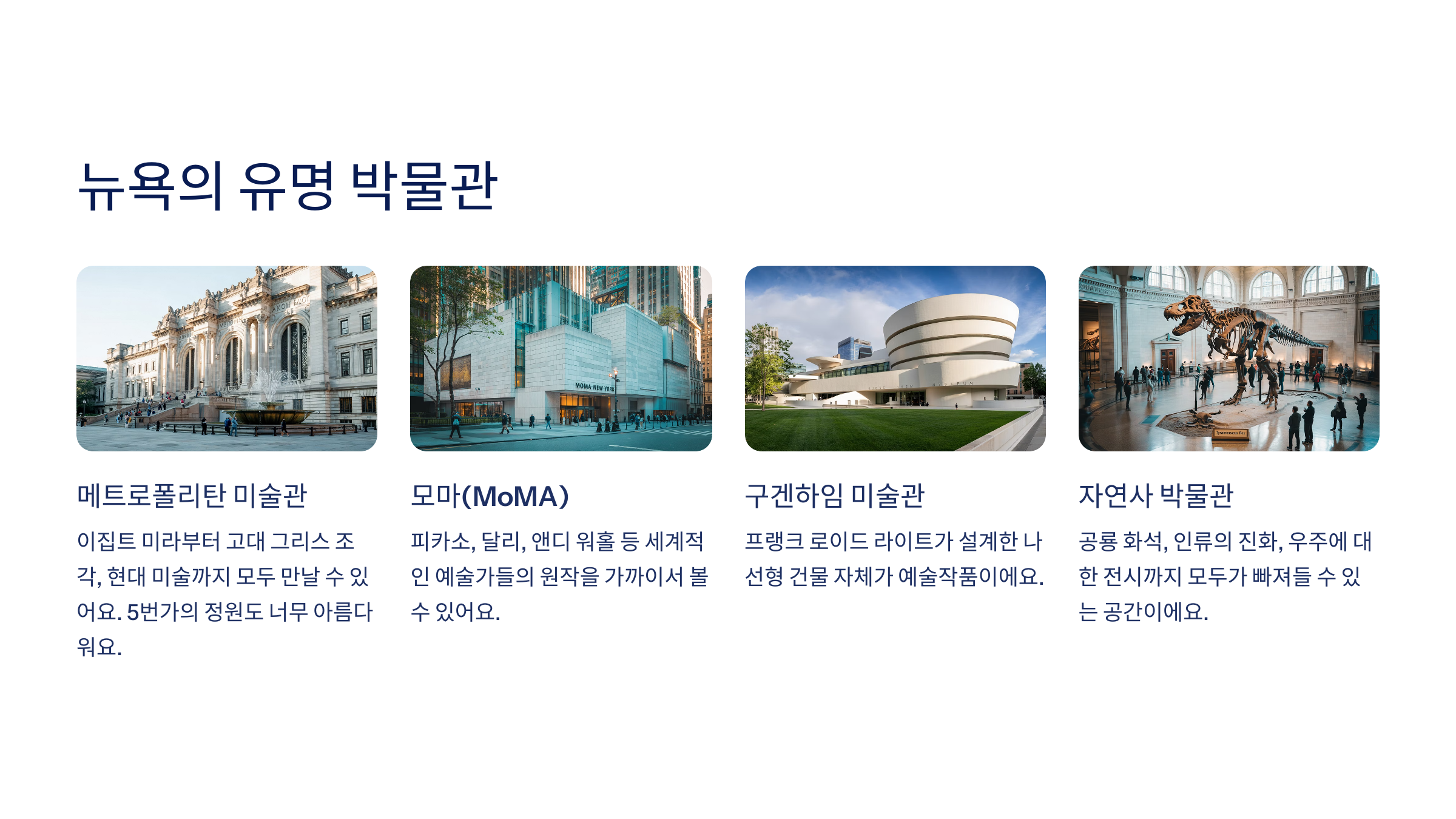 뉴욕은 단순한 여행지가 아니라, 세계적인 문화예술의 중심지예요. 박물관만 하루 종일 돌아다녀도 시간이 모자랄 정도로 알찬 콘텐츠가 가득하죠. 예술과 역사를 좋아한다면 뉴욕은 꼭 한 번 방문해야 할 도시예요.
