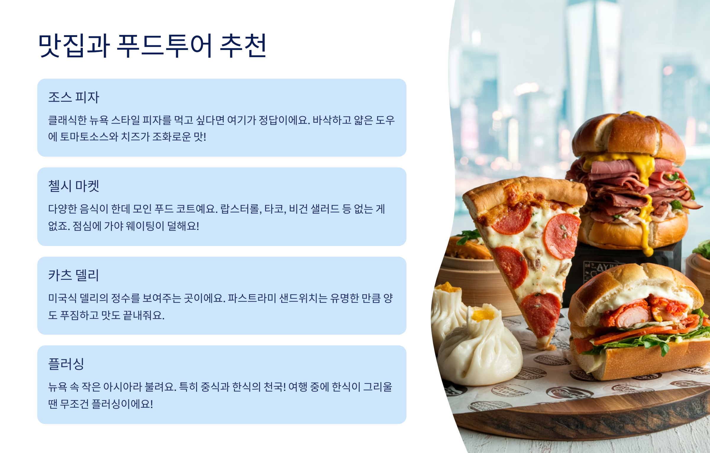 뉴욕은 전 세계의 요리를 한 도시에서 맛볼 수 있는 미식 천국이에요. 각 지역마다 분위기도 다르고 음식 스타일도 달라서 하루에 세 끼가 모자랄 정도랍니다. 무엇보다 '먹는 여행' 좋아하는 분들에겐 뉴욕이 최고의 목적지예요! 🍽️