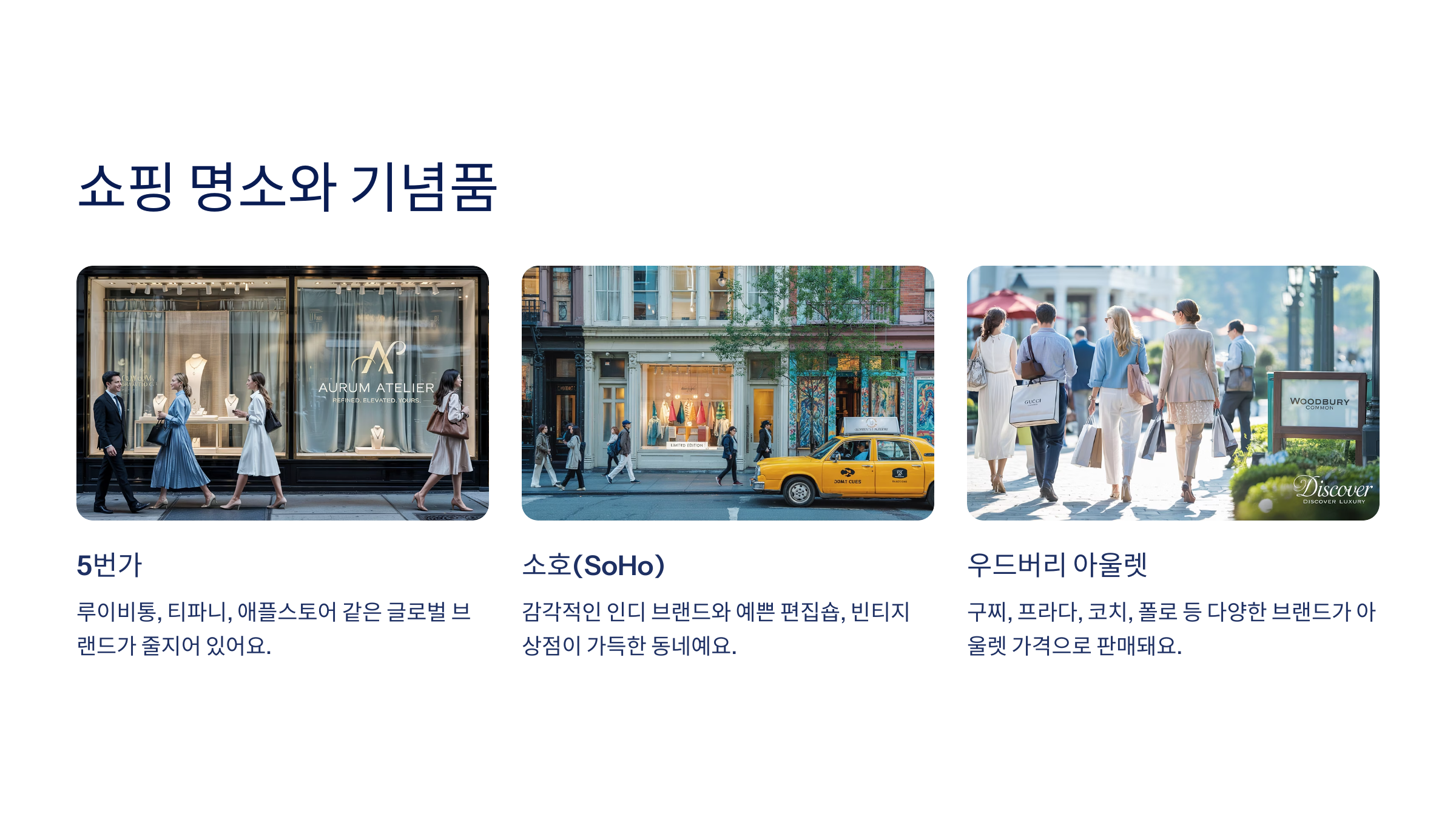 | 5번가 | 맨해튼 중심 | 명품, 글로벌 브랜드 집중 | 럭셔리 브랜드 |
