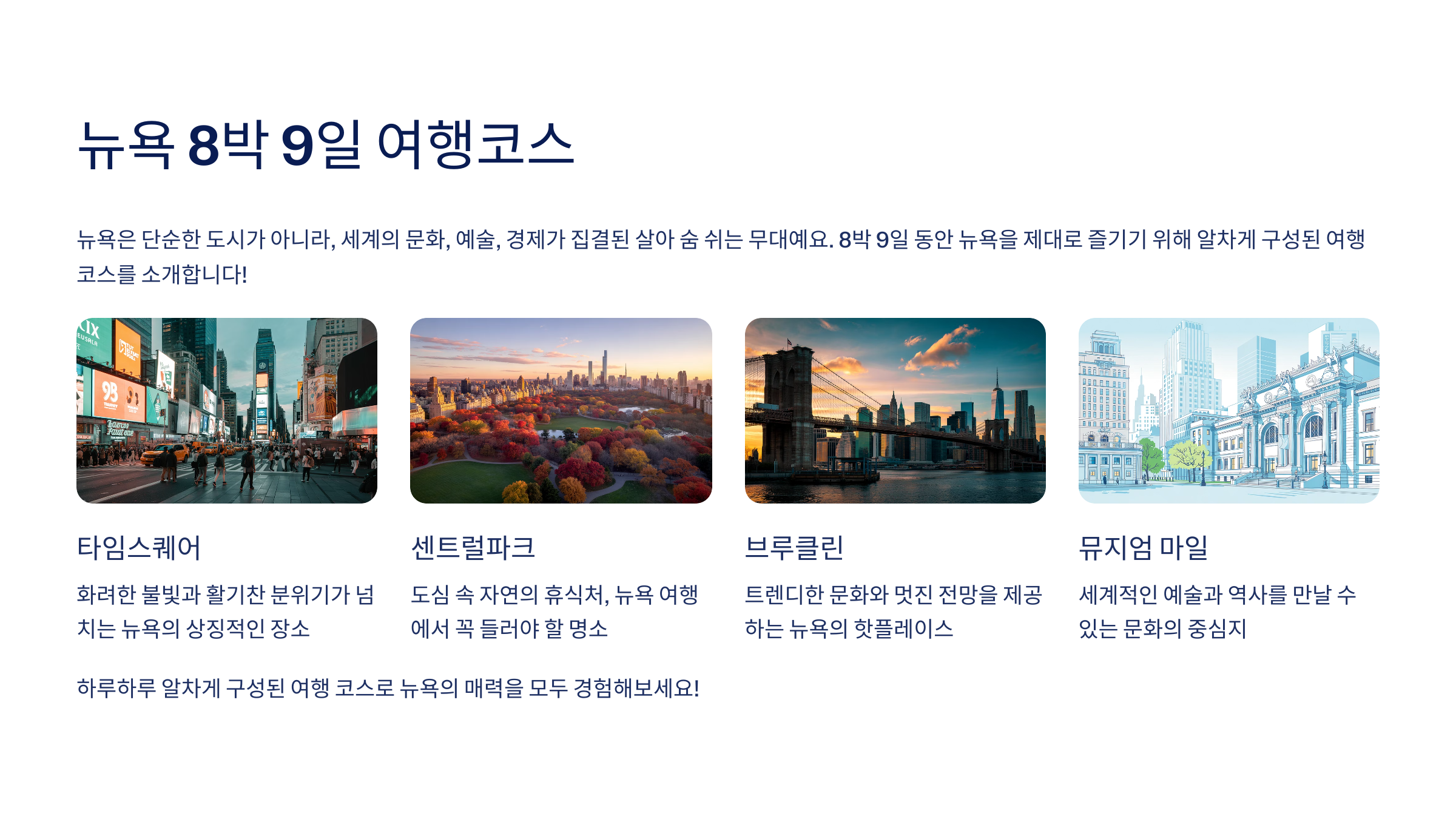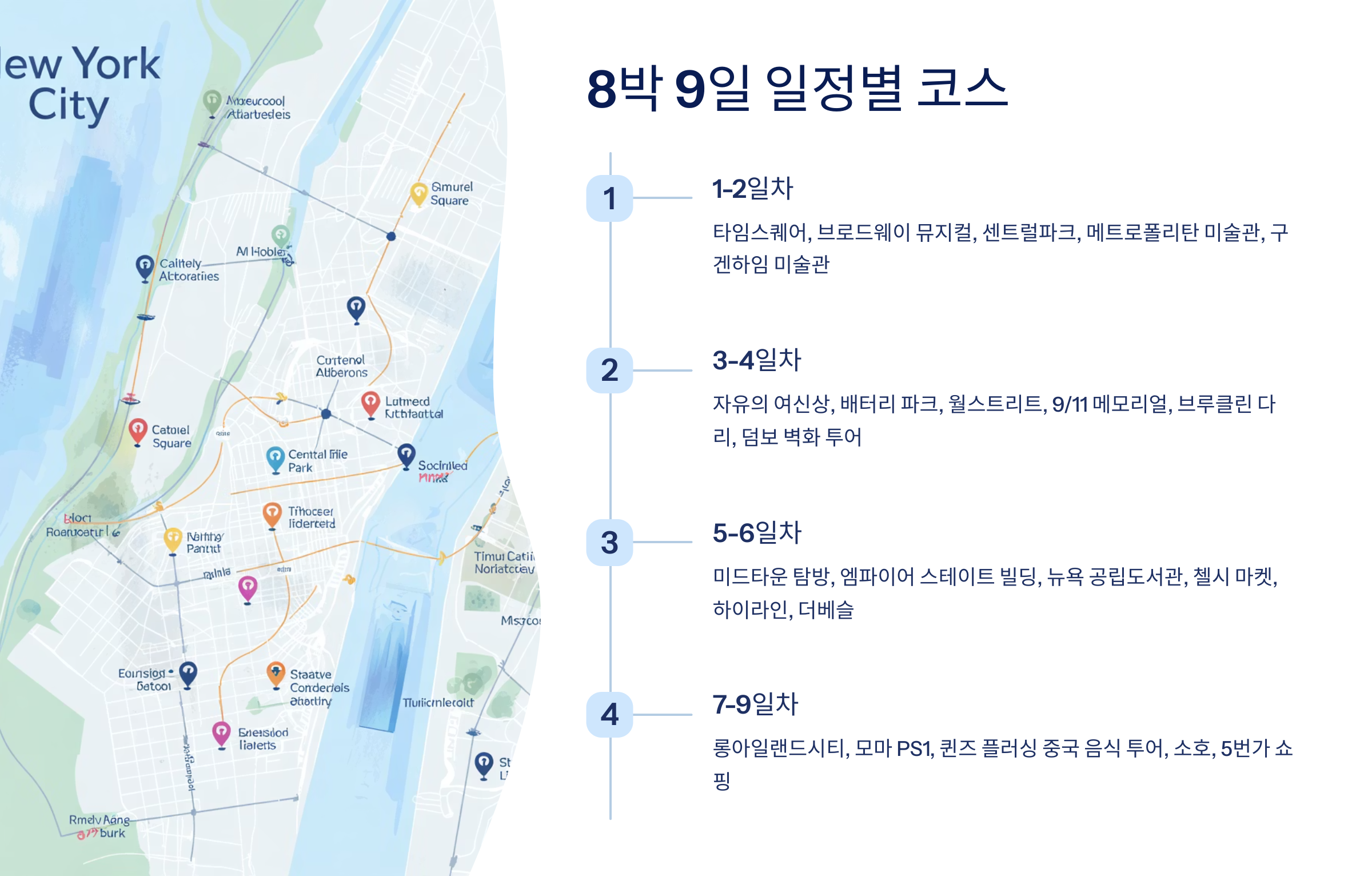 뉴욕은 단순한 도시가 아니라, 세계의 문화, 예술, 경제가 집결된 살아 숨 쉬는 무대예요. 8박 9일 동안 뉴욕을 제대로 즐기기 위해선 잘 짜인 루트가 필요하죠! 🗽