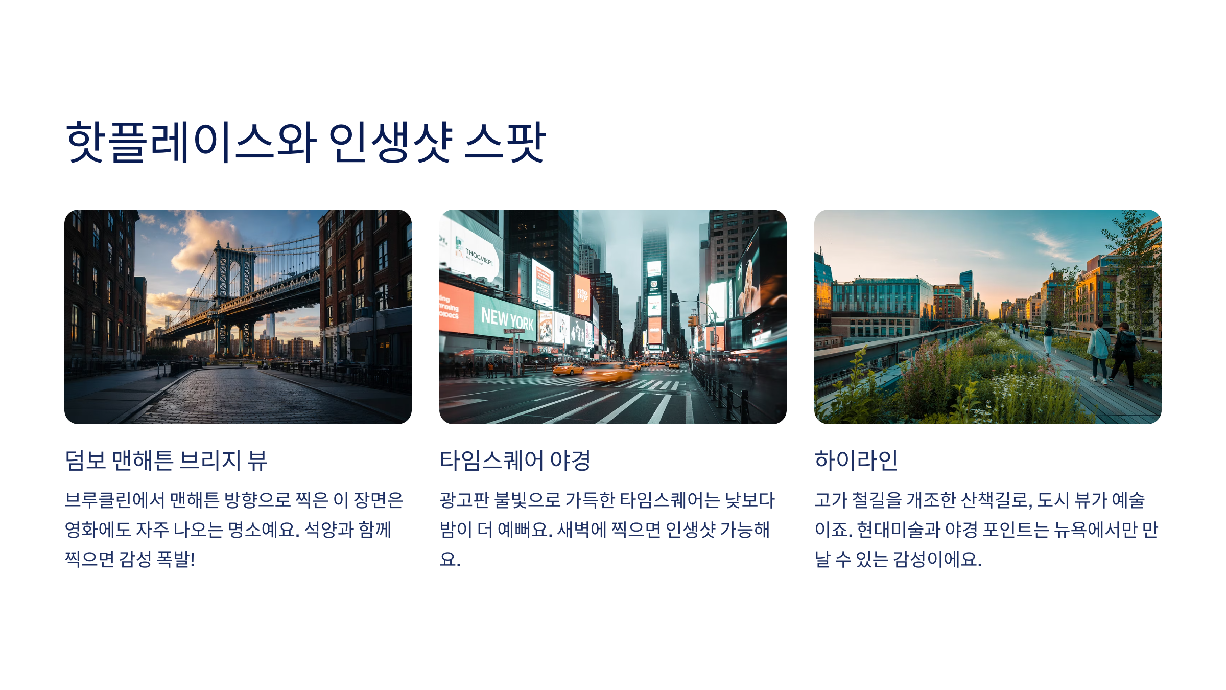 이 일정을 기준으로 하면 동선이 겹치지 않고, 매일 다른 분위기의 뉴욕을 느낄 수 있어요. 브루클린의 예술적인 감성과 맨해튼의 번쩍이는 빌딩을 하루하루 비교하며 즐기는 재미도 크답니다.