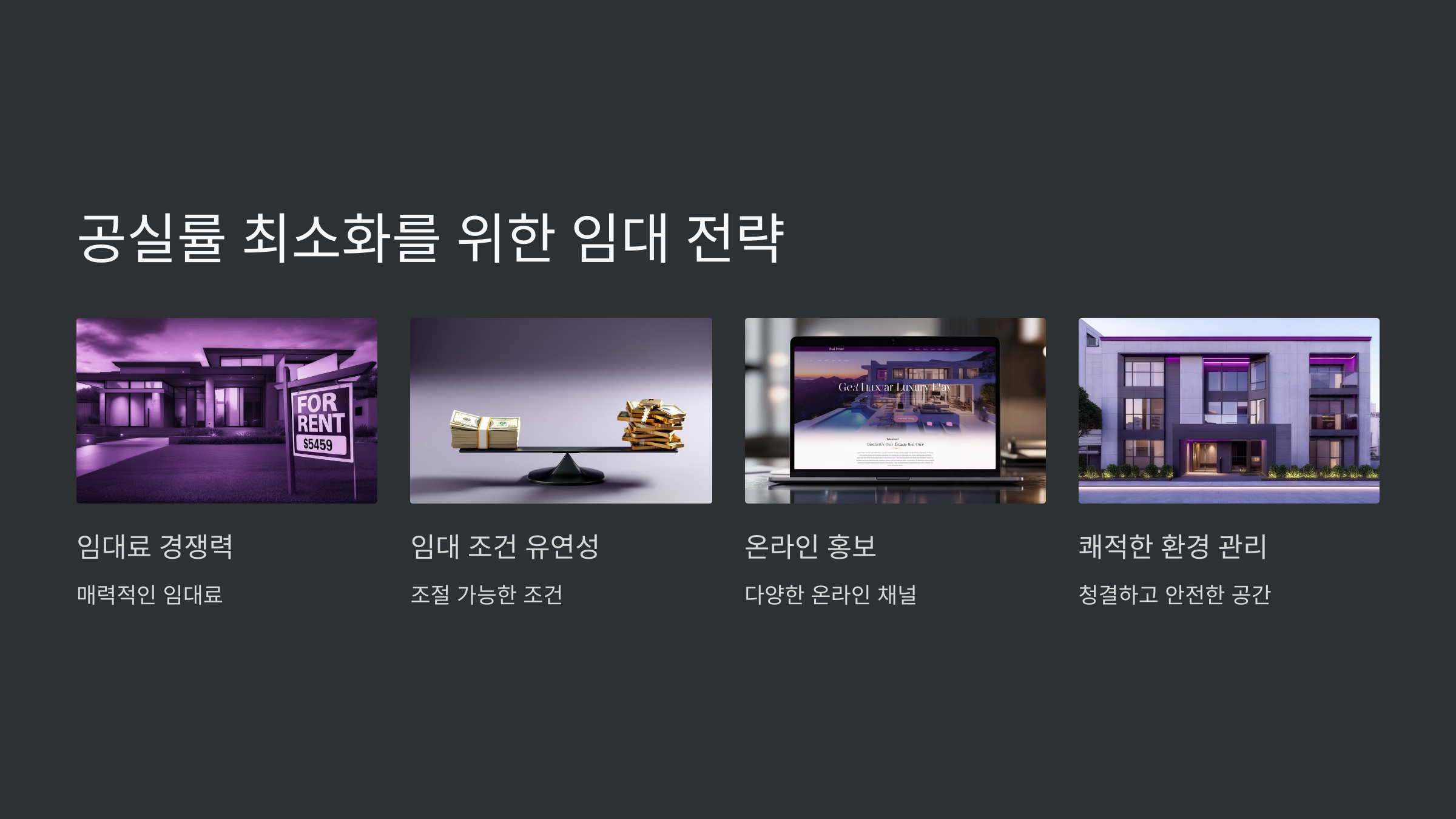| 임대료 경쟁력 | 적정 수준의 임대료 유지 | 세입자 유치 속도 증가 |