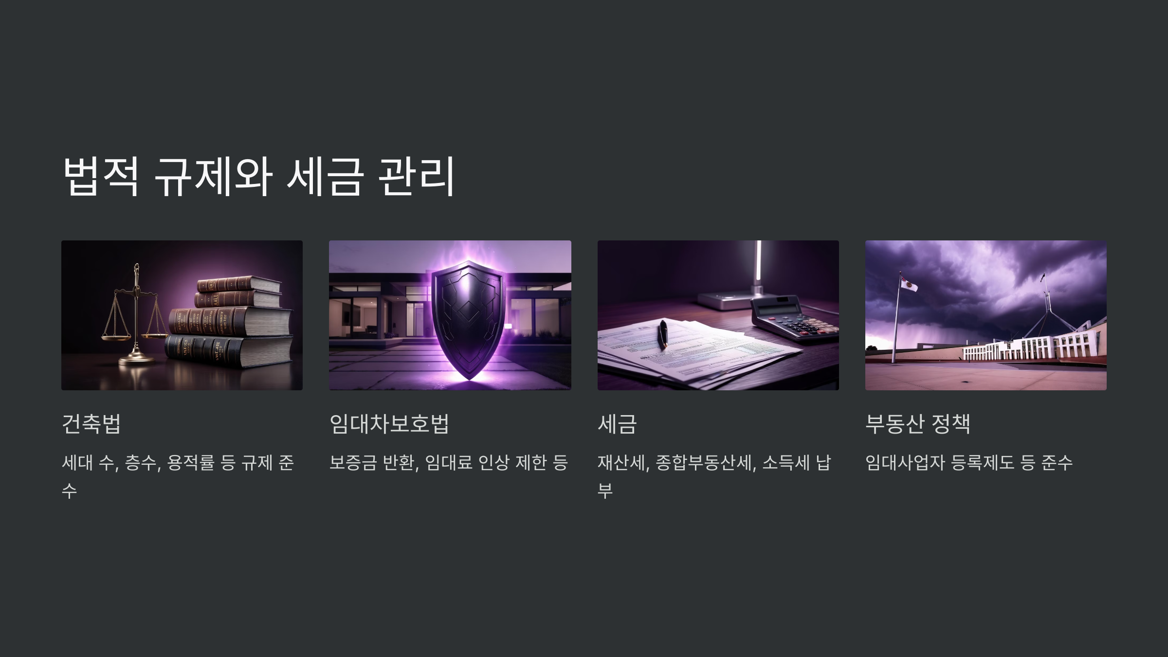 | 세입자 관리 | 임대료 미납, 계약 위반 | 계약서 명확화 및 정기 소통 |
