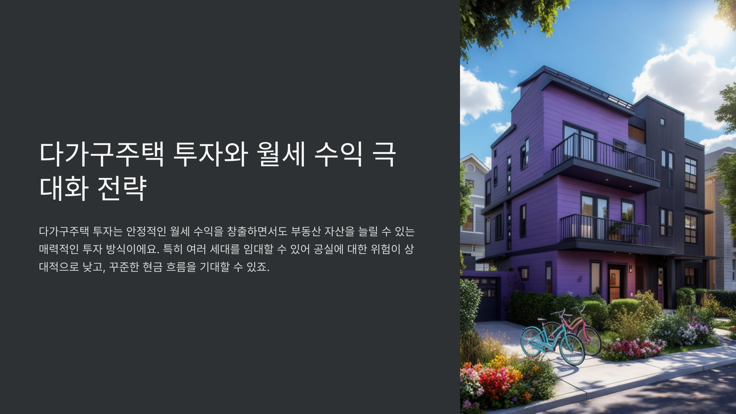 다가구주택 투자는 안정적인 월세 수익을 창출하면서도 부동산 자산을 늘릴 수 있는 매력적인 투자 방식이에요. 특히 여러 세대를 임대할 수 있어 공실에 대한 위험이 상대적으로 낮고, 꾸준한 현금 흐름을 기대할 수 있죠. 😊
