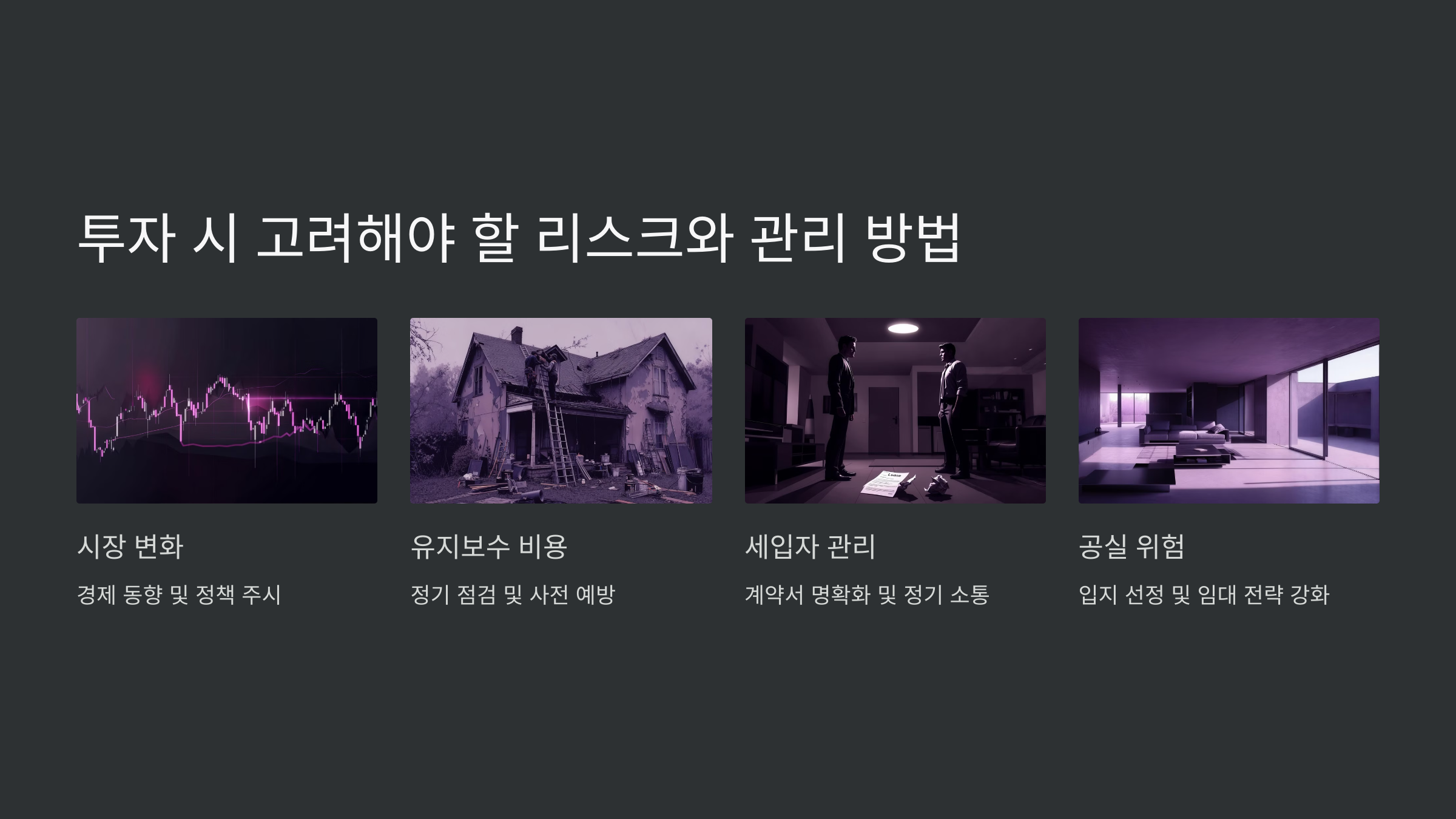 | 공실 위험 | 세입자 부족, 입지 문제 | 입지 선정 및 임대 전략 강화 |
