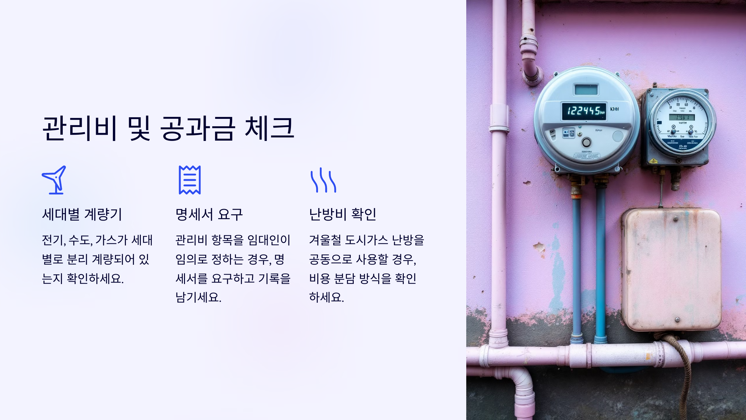 전기, 수도, 가스가 세대별로 분리 계량돼 있지 않다면? 매달 사용하는 양에 비해 요금이 높게 나올 수 있어요. 특히 관리비 항목을 임대인이 임의로 정하고, 현금으로만 받는 경우는 반드시 명세서를 요구하고 기록을 남겨야 해요.
