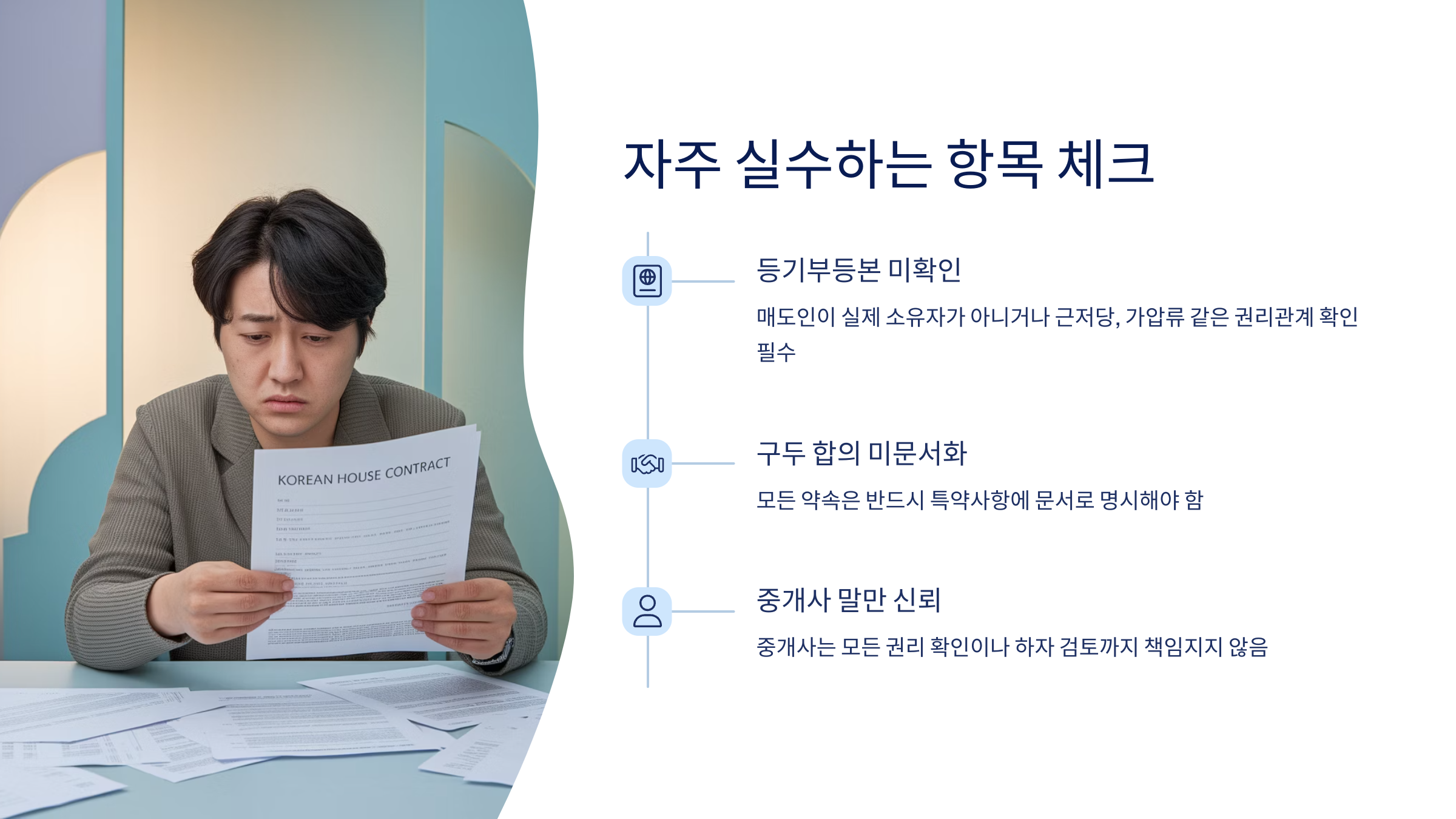 두 번째는 '구두 합의를 문서화하지 않음'이에요. 예를 들어, 매도인이 집을 깨끗이 청소해주겠다고 했거나, 특정 가구를 두고 가기로 한 약속이 있다면 반드시 특약사항에 명시해야 해요. 나중에 “그런 얘기 안 했다”고 나오면 증거가 없어서 난처해져요.
