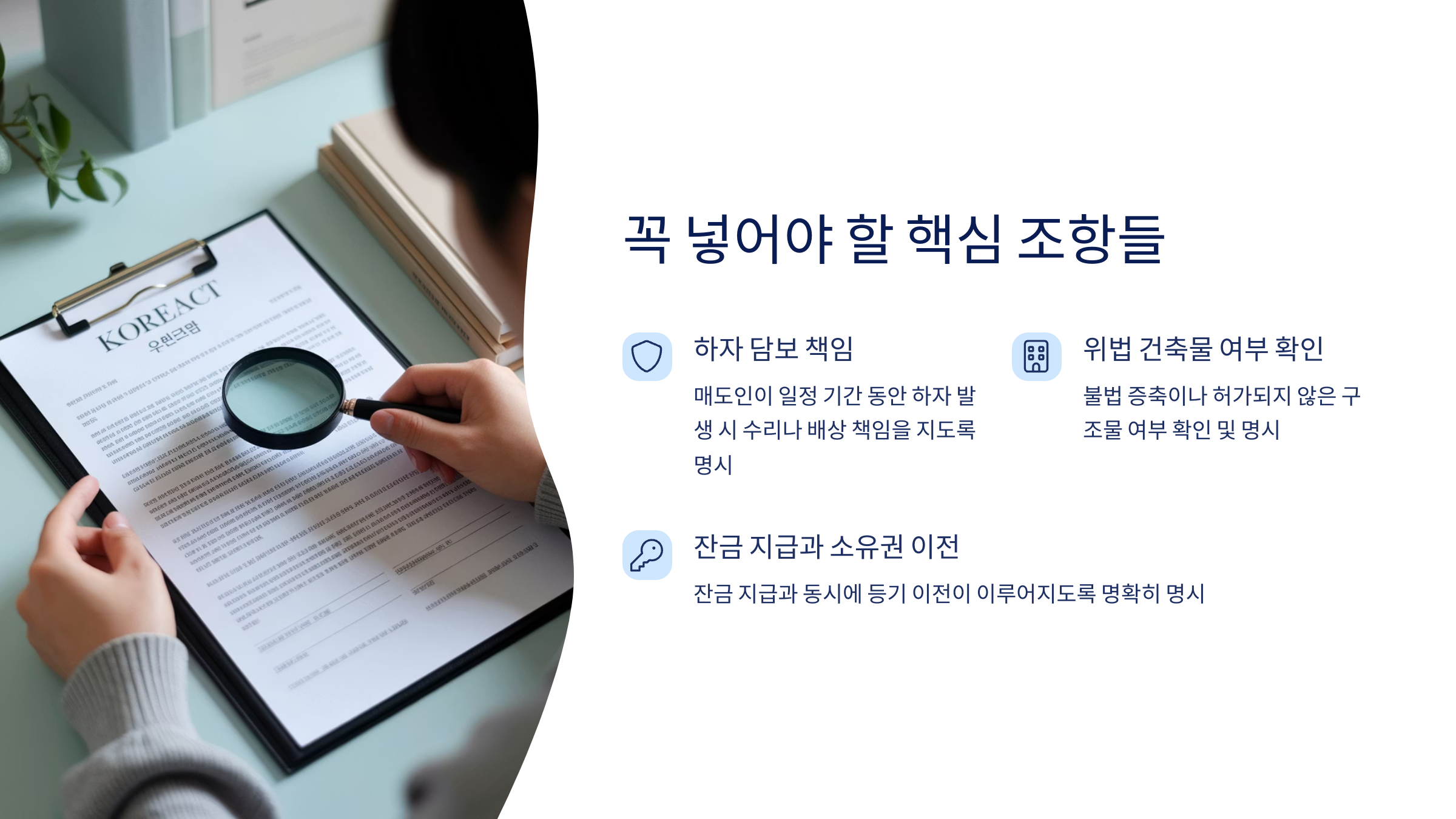 A2. 하자담보책임, 불법 건축물 여부, 소유권 이전 조건, 특약사항은 반드시 들어가야 해요. 이 조항들 없으면 나중에 분쟁 생길 확률 높아요.
