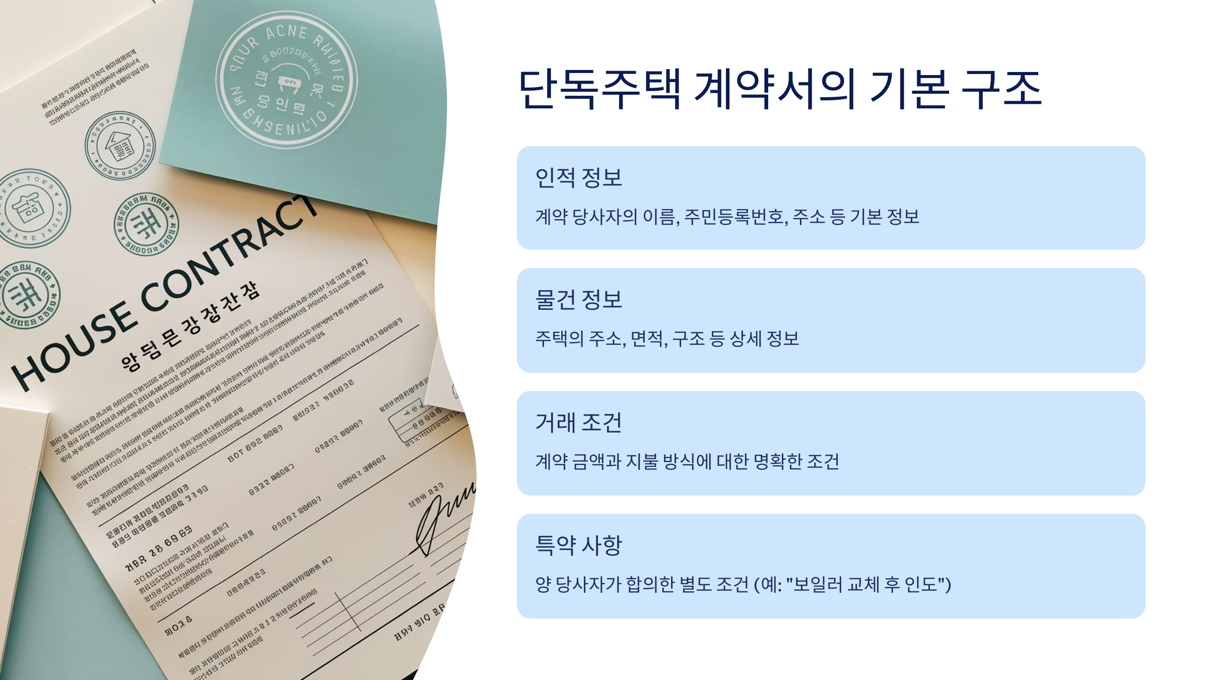 계약서를 쓸 때 가장 중요한 건 '꼭 들어가야 할 조항'을 빠뜨리지 않는 거예요. 특히 단독주택 거래는 건물 상태나 하자 여부, 건축허가 관련 이슈가 많아서 조항 하나하나가 무척 중요하답니다.