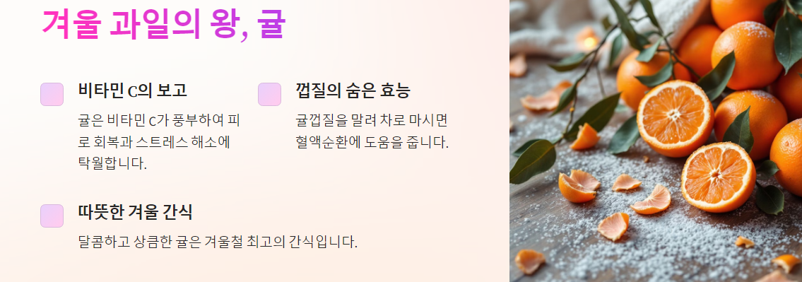 귤은 겨울철 대표 과일로, 비타민 C가 풍부하여 피로 회복과 스트레스 해소에 탁월합니다. 귤껍질은 말려서 차로 마시면 혈액순환에 도움을 주며, 따뜻한 음료로 몸을 데워줍니다.