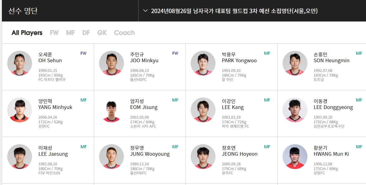2024년 8월 26일 발표된 대한민국 축구 국가대표팀 명단은 팬들에게 큰 기대를 모으고 있습니다. 이번 26인 명단은 공격진부터 골키퍼까지 다양한 선수들로 구성되어 있으며, 해외파와 국내파의 조화가 돋보입니다.