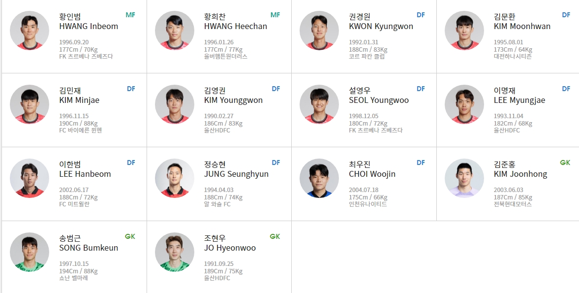 수비진에는 김민재(바이에른 뮌헨)와 권경원(알 와크라) 같은 베테랑 선수들이 포함되어 있습니다. 특히 김민재는 바이에른 뮌헨에서 뛰어난 활약을 보여주고 있어, 대표팀에서도 그의 활약이 큰 기대를 받고 있습니다. 이 외에도 최우진(포항 스틸러스), 황문기(대전 하나시티즌)와 같은 젊은 수비수들이 첫 태극마크를 달고 경기에 나설 예정입니다.