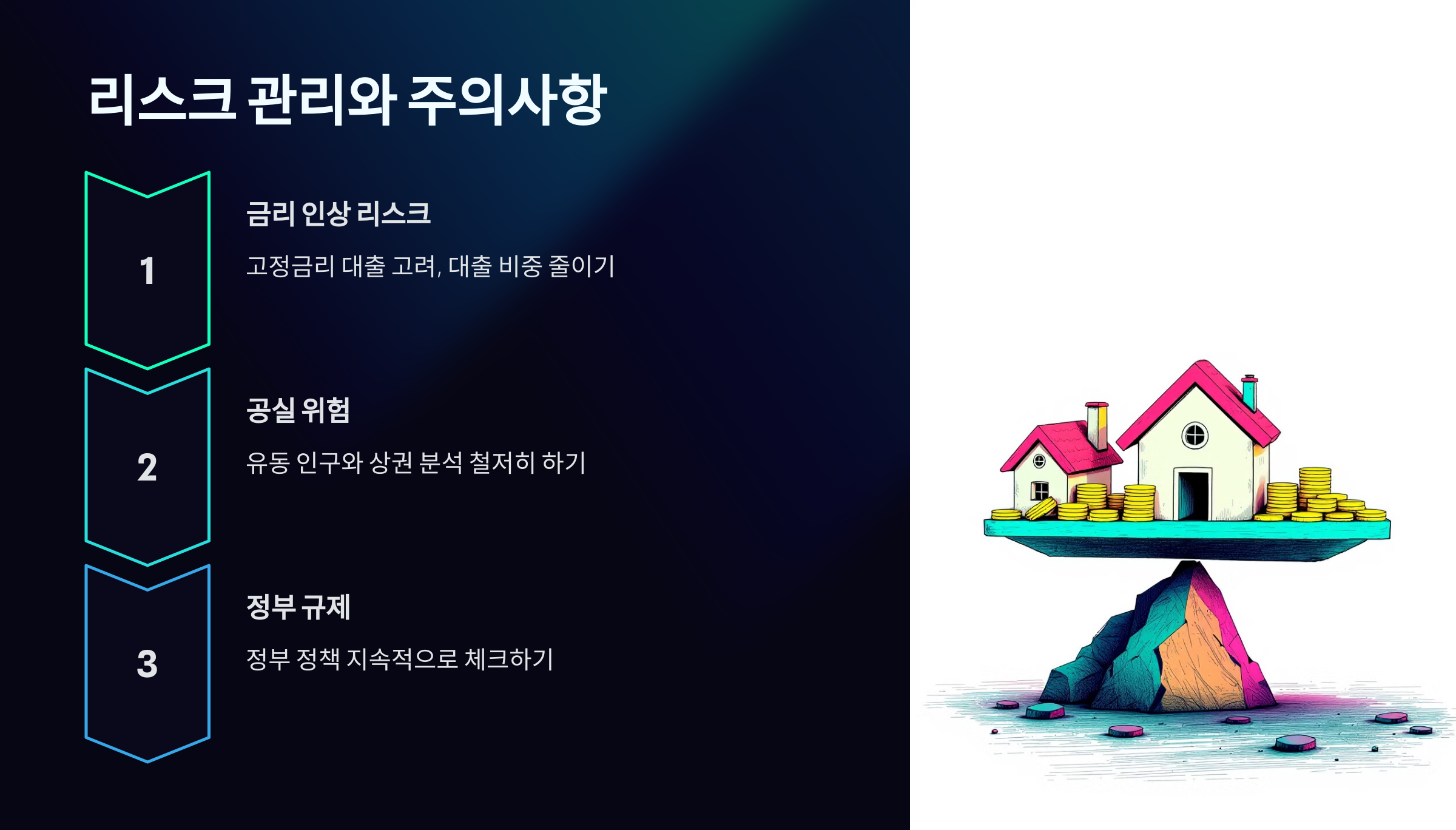 | 공실 발생 | 임대 수익 감소 | 입지 분석 강화, 상권 조사 |