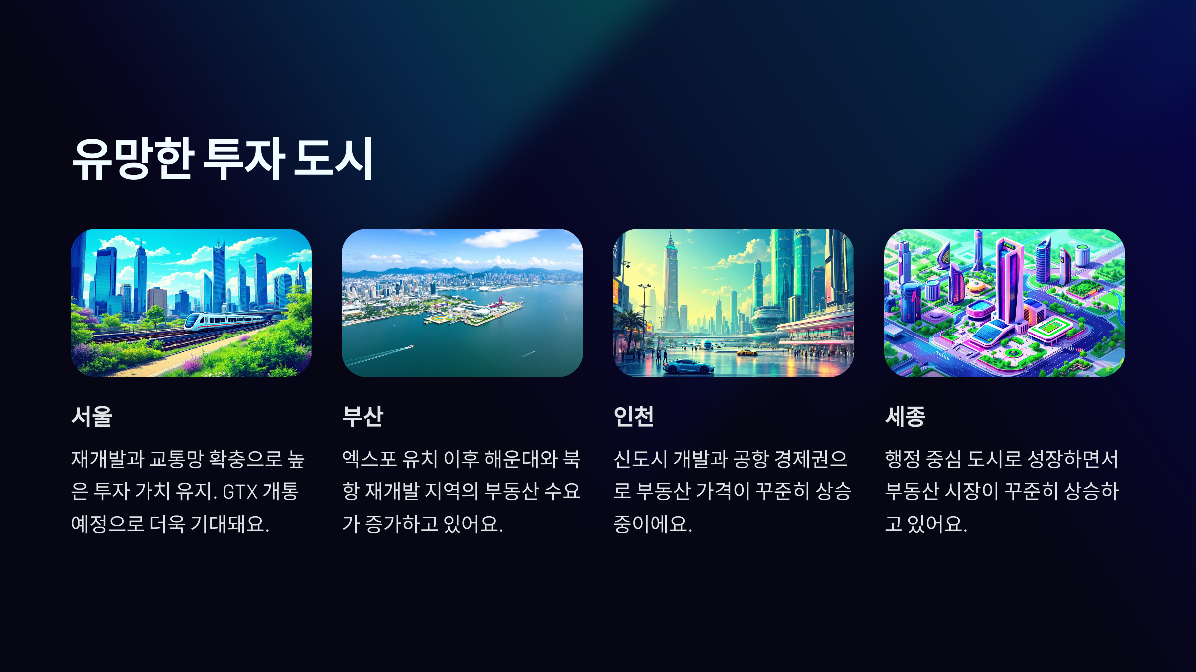 A3. 서울은 여전히 투자 가치가 높지만, 높은 가격이 부담될 수 있어요. 인천, 세종, 부산 같은 신도시 개발 지역은 상대적으로 저렴하면서도 상승 가능성이 높아 유망한 투자처로 꼽혀요.