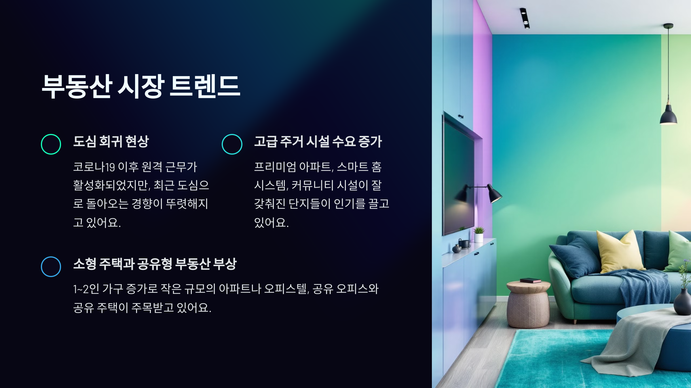 ✅ 세 번째 트렌드는 ‘소형 주택’과 ‘공유형 부동산’의 부상이에요. 1~2인 가구가 증가하면서 작은 규모의 아파트나 오피스텔, 그리고 공유 오피스와 공유 주택 같은 새로운 형태의 부동산이 주목받고 있어요. 이러한 변화는 투자자들에게도 새로운 기회를 제공하고 있어요.