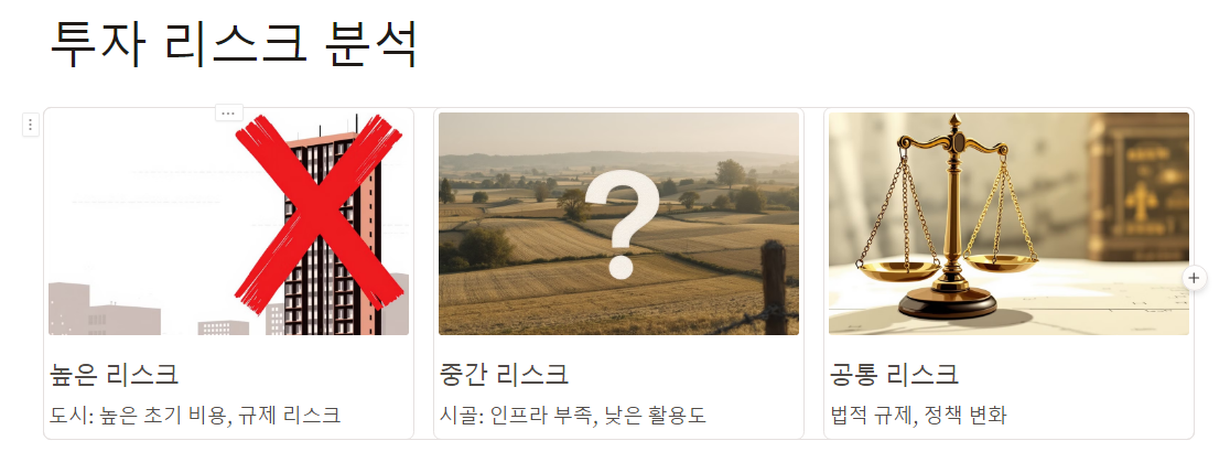 도시 토지는 높은 초기 투자 비용과 규제 리스크가 큽니다.