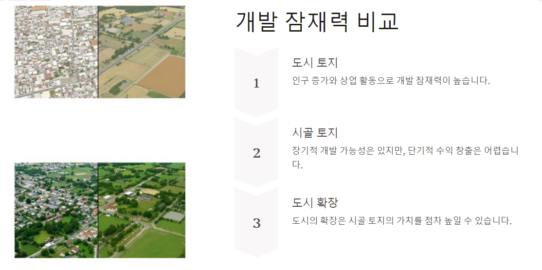 도시 토지는 주로 높은 인구 밀도와 인프라 발전으로 인해 수요가 꾸준히 증가하는 경향이 있습니다. 이는 상업용 및 주거용 개발 기회가 많음을 의미합니다.