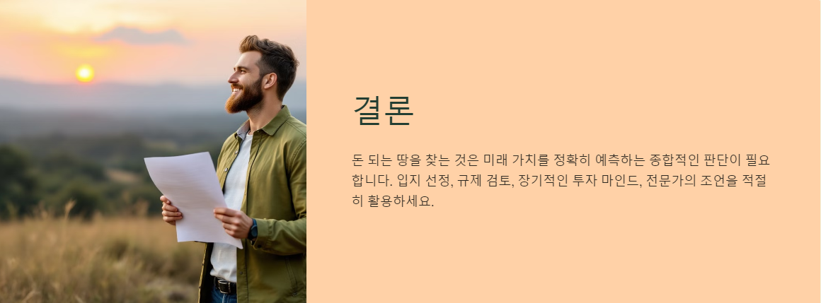 돈 되는 땅을 찾는 것은 단순히 땅을 매입하는 것을 넘어, 미래 가치를 정확히 예측하는 종합적인 판단이 필요합니다. 입지 선정, 규제 검토, 장기적인 투자 마인드, 전문가의 조언을 적절히 활용하면 성공 가능성을 높일 수 있습니다. 무엇보다도 꾸준히 공부하고 실전을 통해 경험을 쌓는 것이 중요합니다.