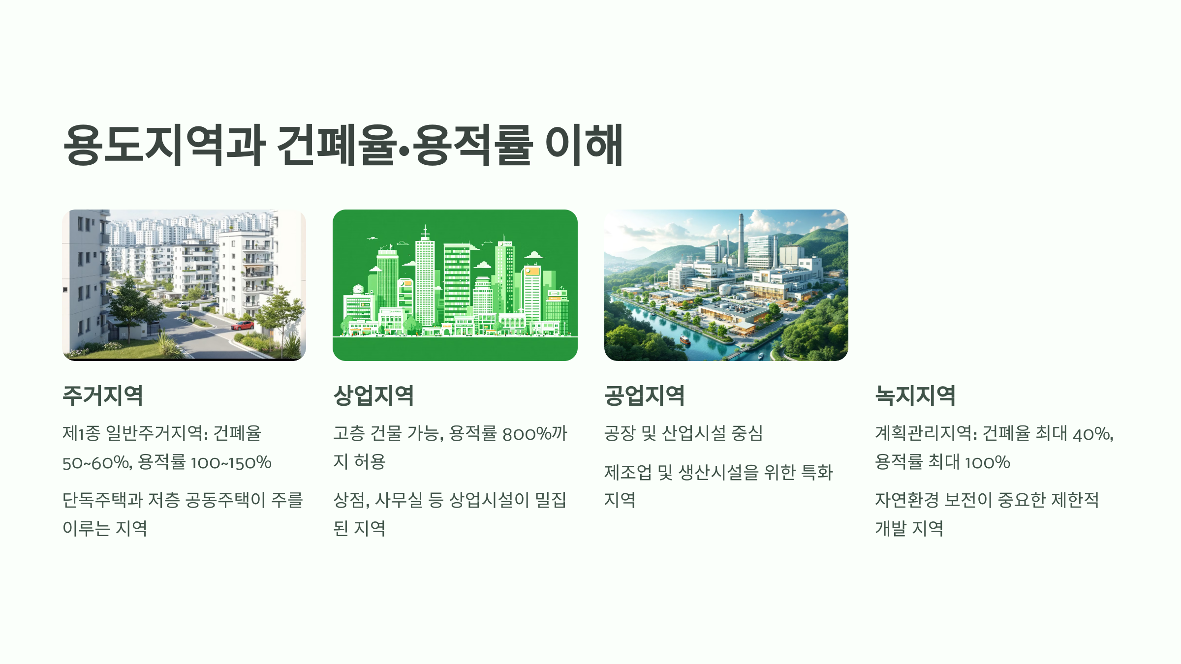 예를 들어 제1종 일반주거지역은 조용한 주택가를 위한 지역이라 건폐율은 50~60%, 용적률은 100~150% 정도로 제한적이에요. 반대로 상업지역은 고층 건물도 가능한 지역이라 용적률이 800%까지도 올라가요. 같은 땅이더라도 용도지역에 따라 건물 높이, 규모가 천차만별이 되는 이유예요.