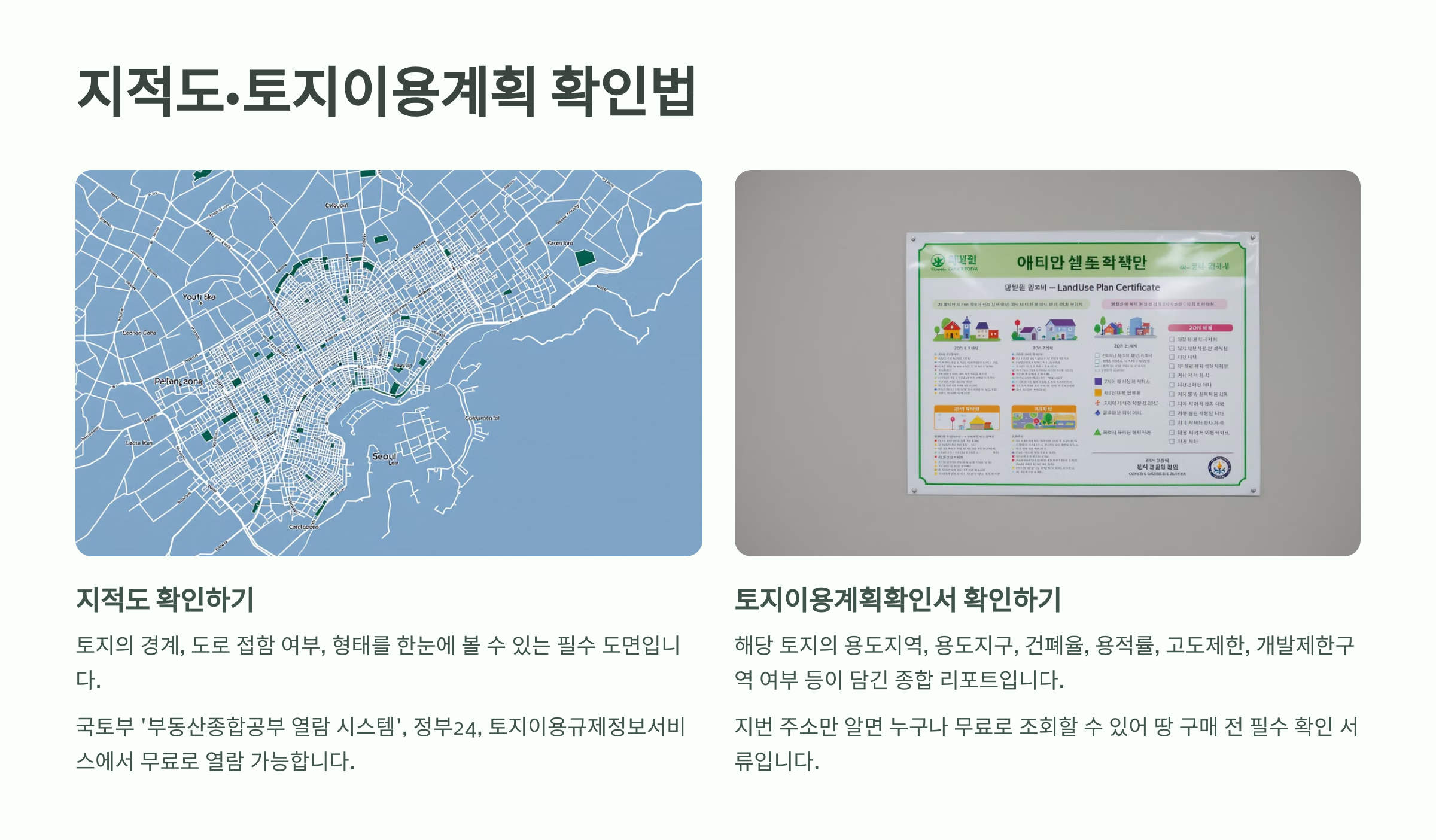 이 두 서류를 꼼꼼히 보고 ‘도로에 잘 붙어 있는 땅인지’, ‘지을 수 있는 면적이 충분한지’, ‘개발제한은 없는지’를 확인하는 게 첫 번째예요. 모든 토지는 주소만 알면 확인할 수 있으니, 계약 전엔 무조건 직접 열람해봐야 해요! 🧐📍