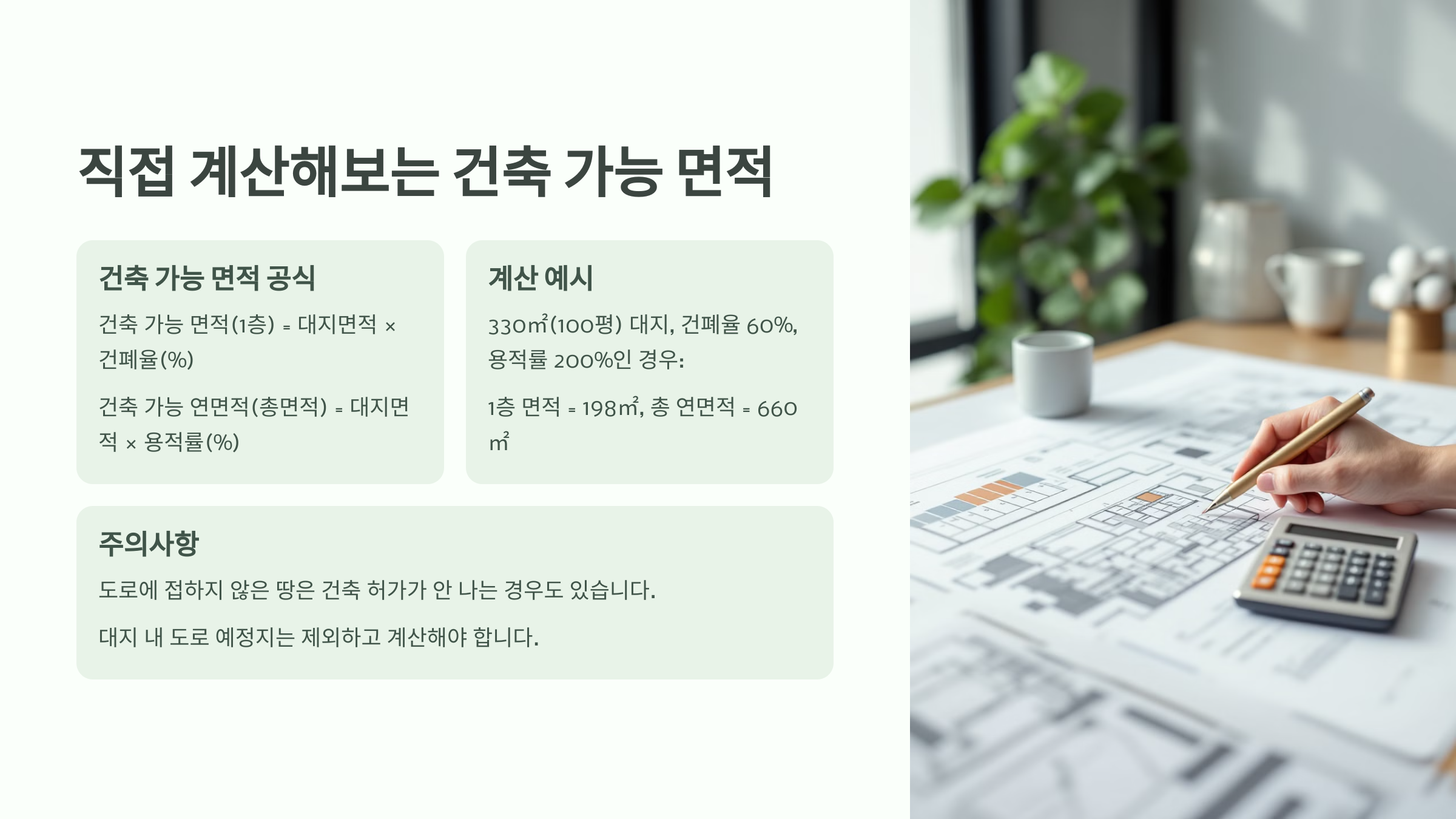 이 계산에서 주의할 점은, 도로에 접하지 않은 땅이라면 실제로는 건축 허가가 안 나는 경우도 있다는 거예요. 또, 대지 안의 일부가 도로 예정지나 공공시설 부지로 포함되어 있다면 그 부분은 제외하고 계산해야 하니, 지적도와 토지이용계획확인서를 꼭 확인해야 해요!
