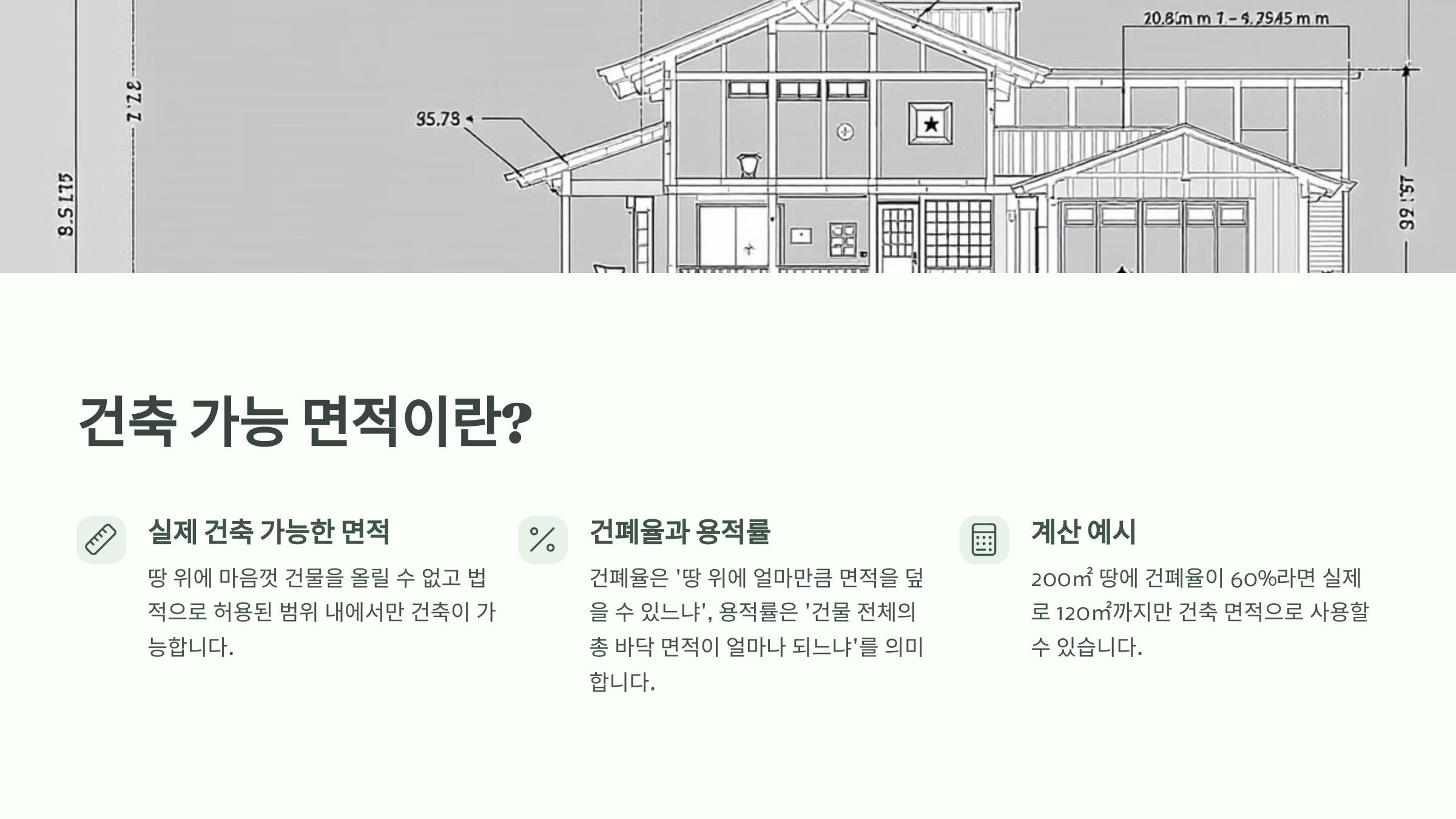 | 건폐율 | 대지 면적 대비 건축 면적 비율 | 60%면 100㎡ 중 60㎡ 건축 가능 |