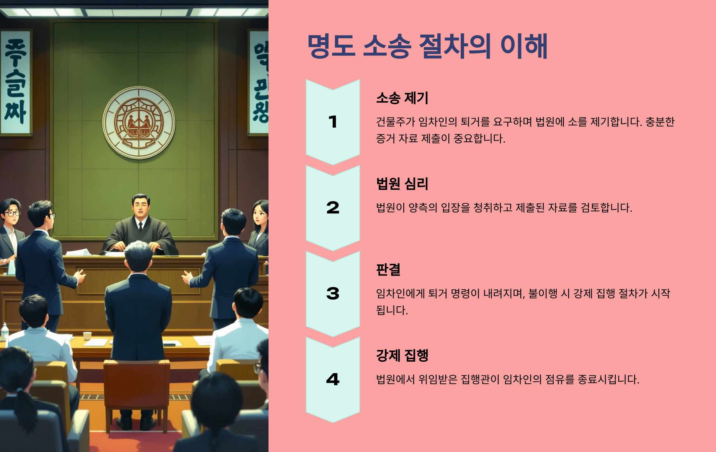 두 번째 단계는 법원 심리예요. 이 단계에서는 법원이 양측의 입장을 청취하고 제출된 자료를 검토해요. 만약 임차인이 계약 조건을 위반했거나 불법적으로 점유 중임이 확인되면 법원은 건물주의 손을 들어주게 돼요.