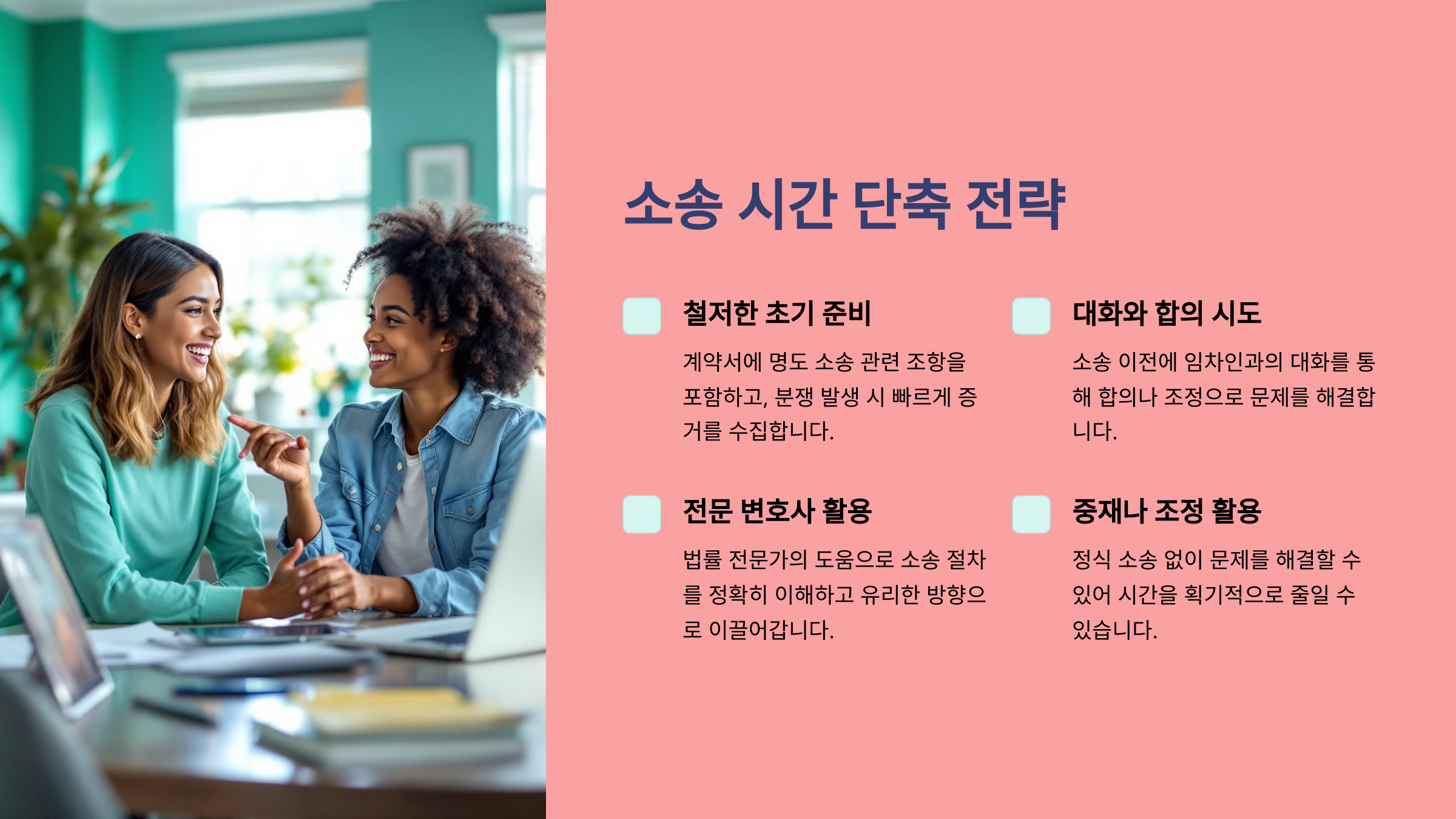 또한, 임차인과의 대화를 통해 소송 이전에 합의나 조정으로 문제를 해결하는 것도 시간을 줄일 수 있는 방법이에요. 예를 들어, 임차인에게 일정 기간 내 자발적으로 퇴거할 경우 일부 채무를 탕감해주는 등의 조건을 제시하는 것도 고려할 수 있죠. 이는 법적 절차를 피할 수 있으므로 건물주와 임차인 모두에게 이익이 될 수 있어요.