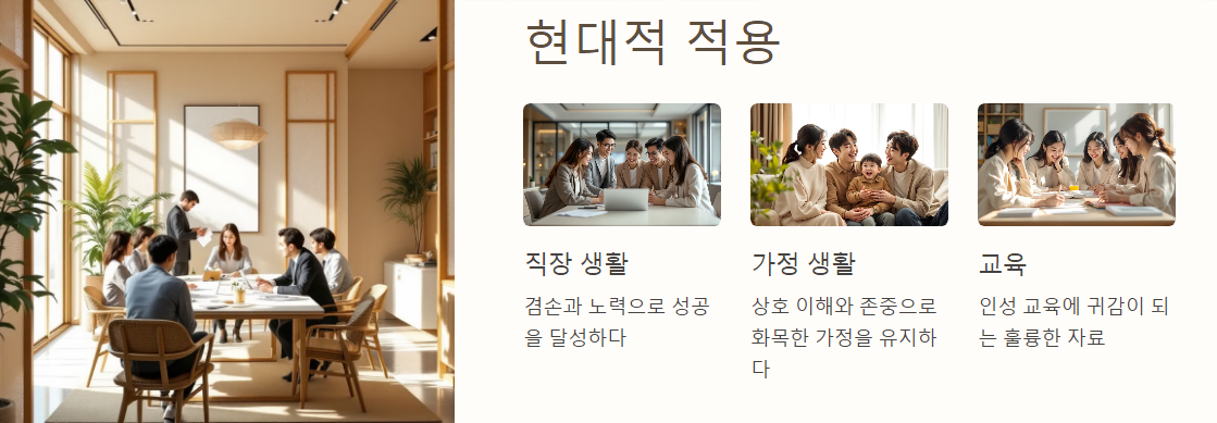 겸손과 꾸준한 노력은 직장에서의 성공에 필수적입니다. 또한, 자기성찰은 업무 효율성을 높이고 인간관계를 개선하는 데 큰 도움을 줍니다. 예를 들어, 프로젝트 실패 후 명심보감의 가르침을 따라 자신의 실수를 돌아보고 개선점을 찾는다면 더 나은 성과를 낼 수 있습니다.