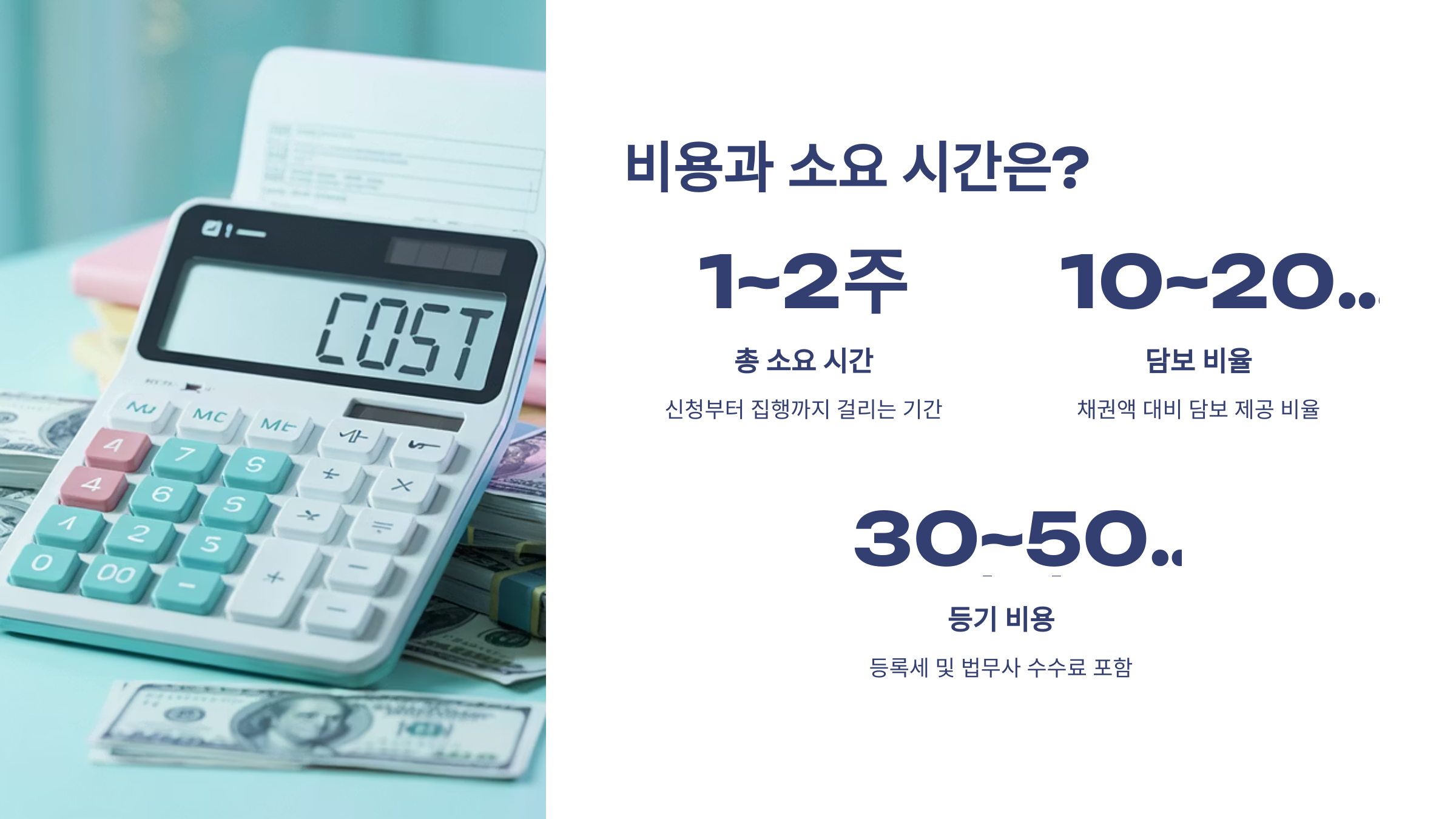 | 담보 비용 | 현금 또는 보증보험 | 채권액의 10~20% |