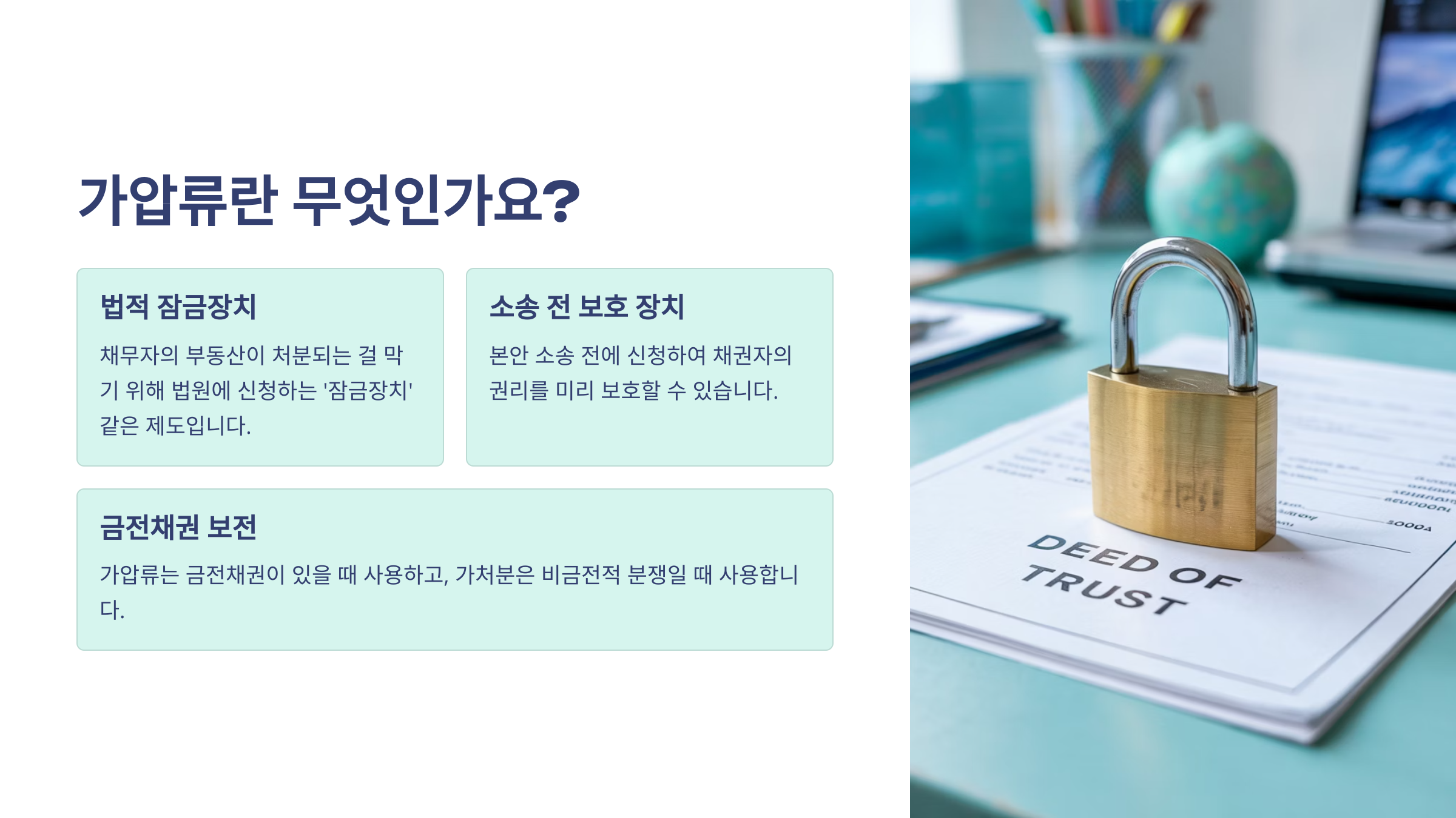 부동산 가압류는 채권자가 채무자에게 돈을 받아야 할 상황에서, 채무자의 부동산이 처분되는 걸 막기 위해 법원에 신청하는 ‘잠금장치’ 같은 제도예요. 쉽게 말해, 채무자가 집을 팔거나 증여하려고 할 때 그걸 막아버리는 법적 장치랍니다. 원칙적으로 본안 소송 전에 신청하는데, 이걸 통해 채권자의 권리를 미리 보호할 수 있어요.