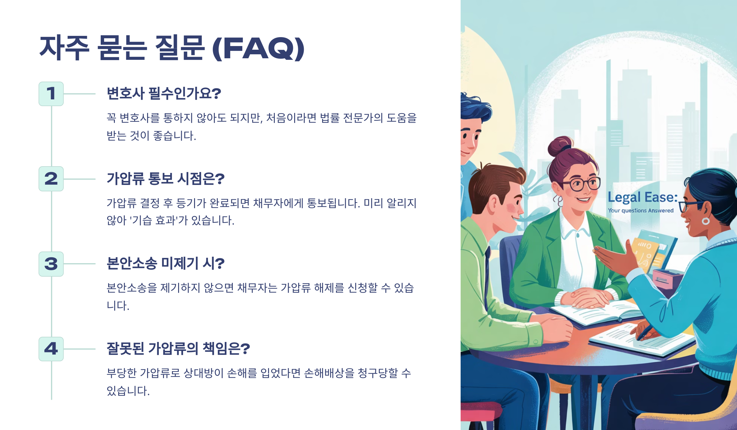 실무에서 자주 생기는 실수는 ‘소명자료 부족’, ‘주소나 인적사항 오기재’, ‘담보 준비 지연’이에요. 이 세 가지는 특히 주의해야 해요. 여기에 더해 본안소송으로 이어질 가능성까지 염두에 둔다면, 전문가의 도움을 받는 것도 좋은 선택일 수 있어요.
