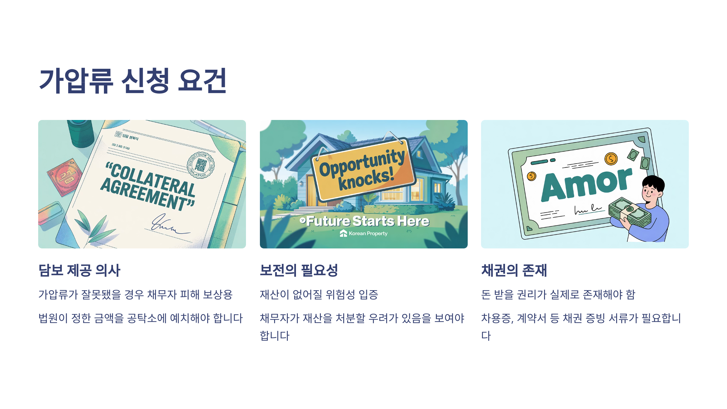 요약하자면, 가압류는 돈과 관련된 문제가 발생했을 때 상대방의 재산을 못 움직이게 잠가두는 기능을 해요. 특히 부동산에 적용되면 효과가 크기 때문에, 권리 보호를 위해 꼭 검토해보는 게 좋아요. 다음 섹션에서는 이 가압류를 하려면 어떤 조건이 필요한지 알려줄게요! 👇