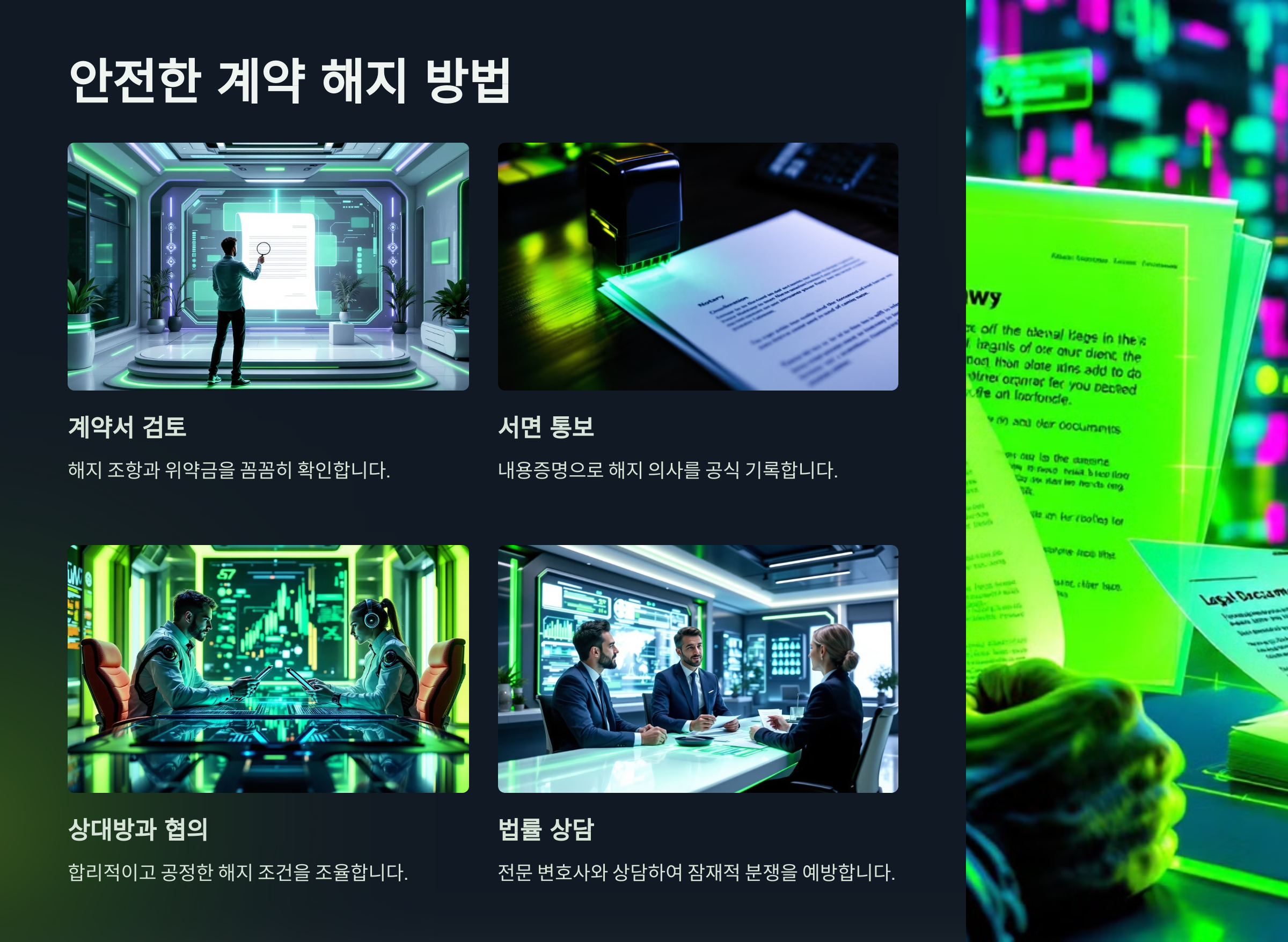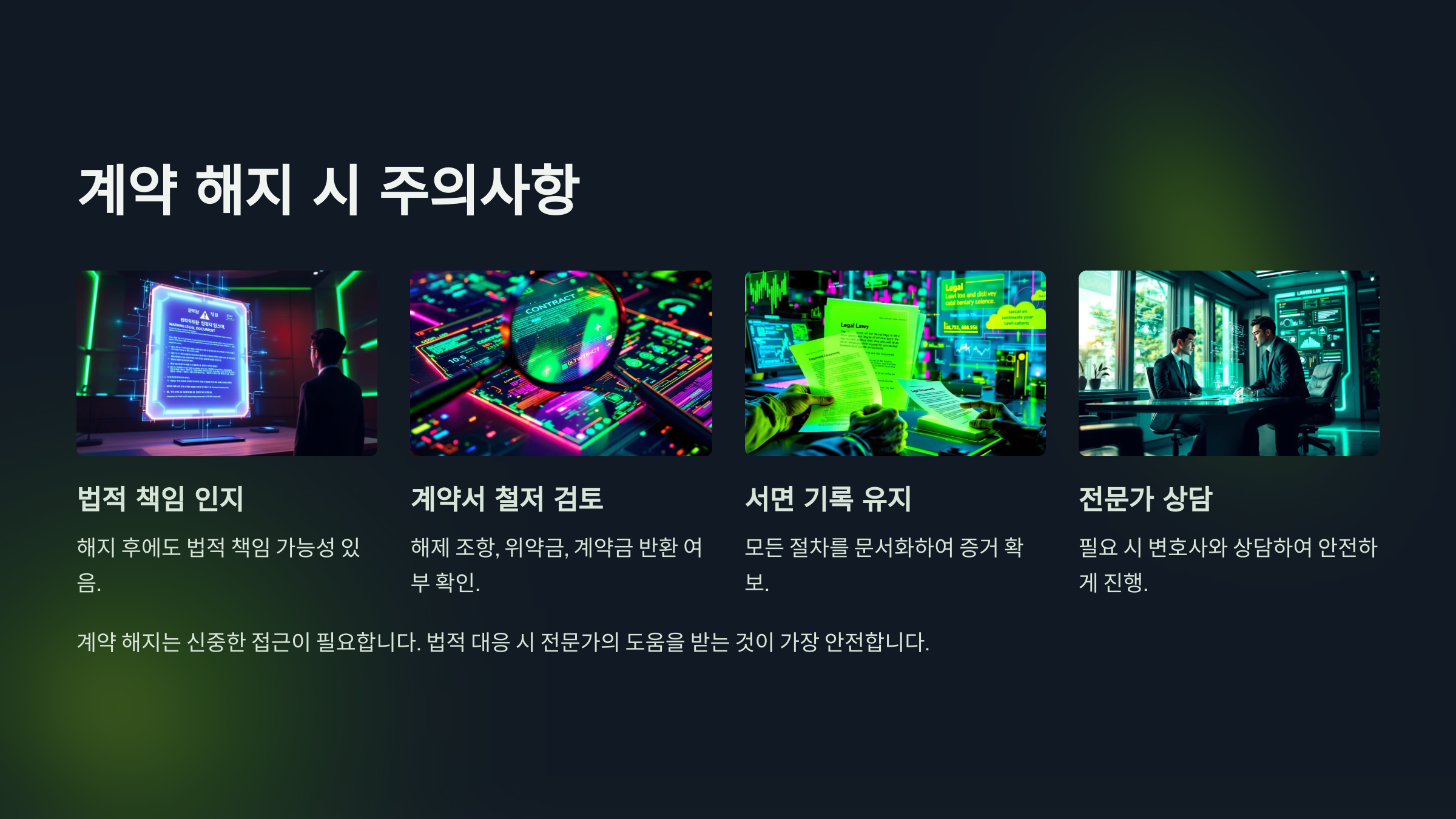 📌 계약 해지는 신중한 접근이 필요한 문제예요. 계약서 조항을 철저히 검토하고, 법적 대응이 필요할 경우 전문가의 도움을 받는 것이 가장 안전한 방법이에요!