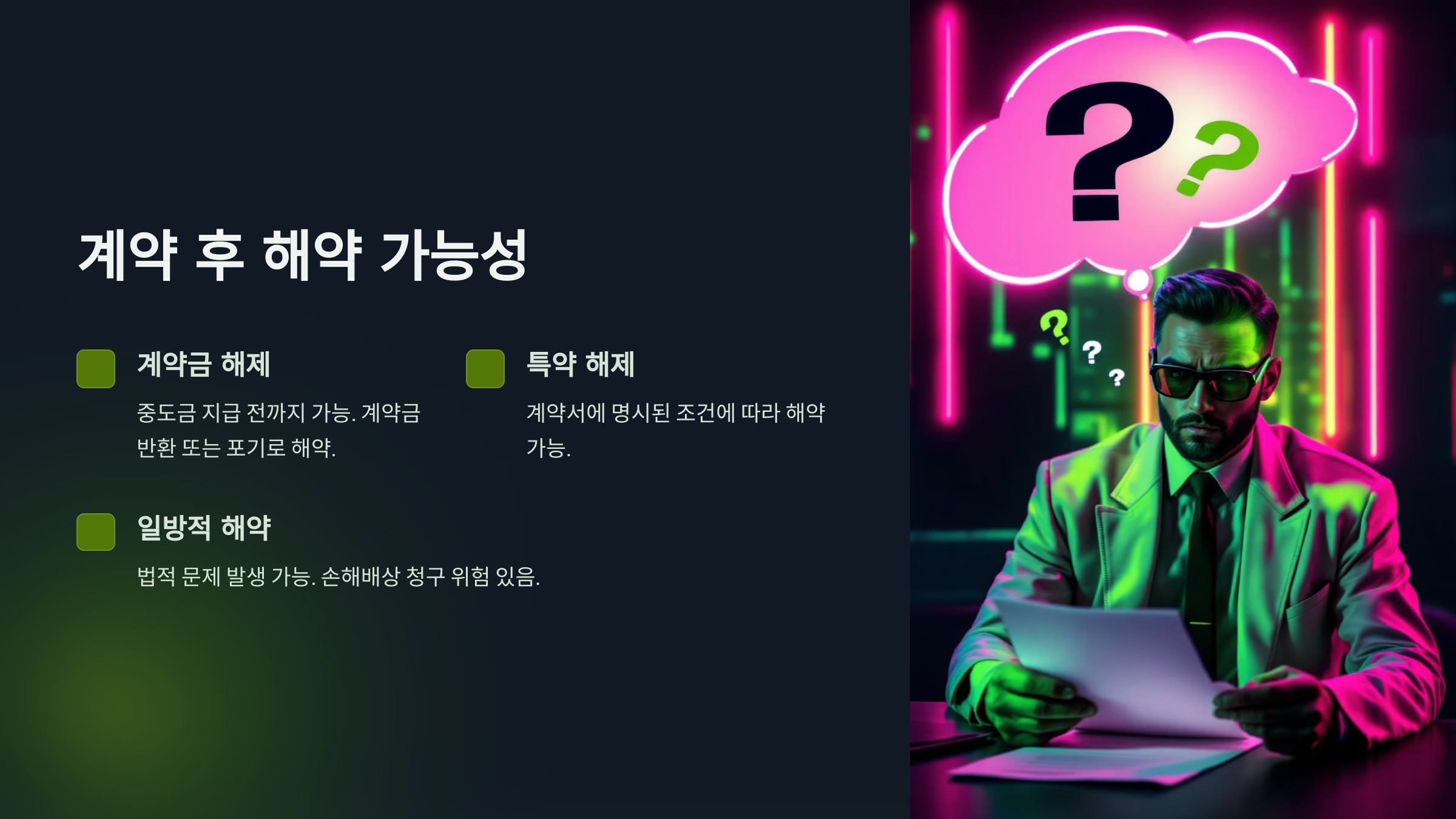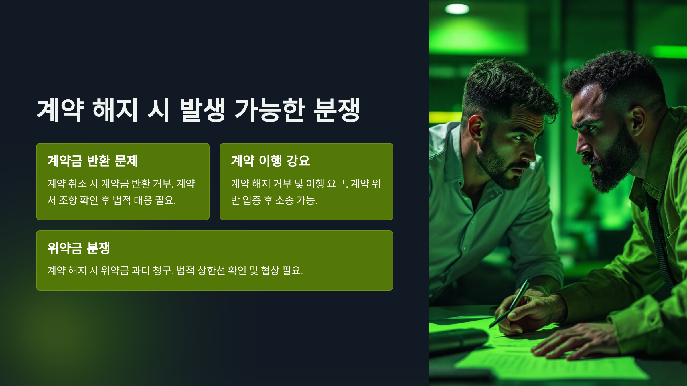 | 계약서 검토 | 해제 조건 및 위약금 조항 확인 | 조항 해석에 따라 법적 분쟁 가능 |