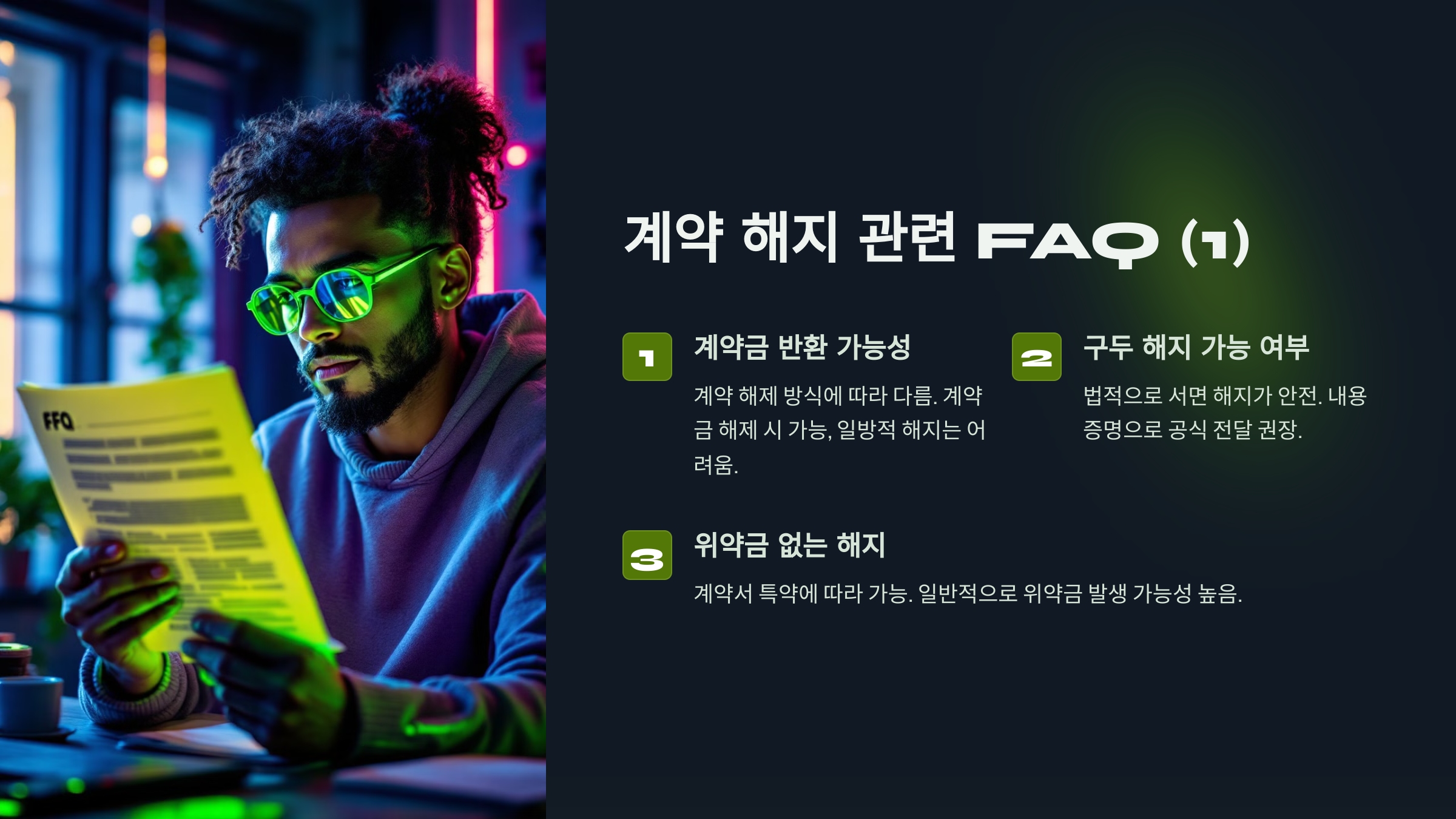 A8. 계약서의 해제 조항, 위약금 조항, 계약금 반환 여부 등을 꼼꼼히 확인해야 해요. 또한, 계약 해지 절차를 서면으로 남기고, 필요한 경우 변호사와 상담하는 것이 좋아요.