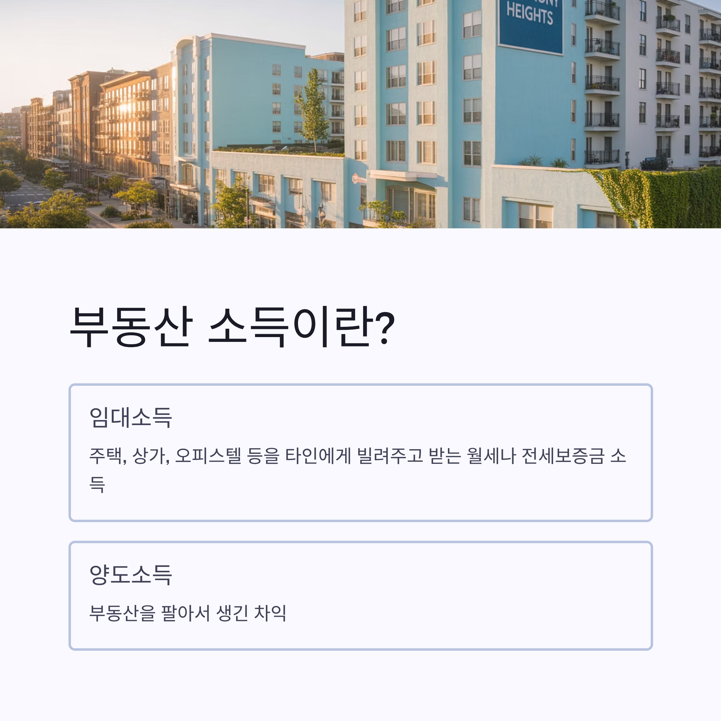부동산 소득은 크게 임대소득과 양도소득으로 나눠져요. 임대소득은 말 그대로 주택, 상가, 오피스텔 등을 타인에게 빌려주고 받는 월세나 전세보증금 등의 소득을 말하고, 양도소득은 부동산을 팔아서 생긴 차익을 의미해요.