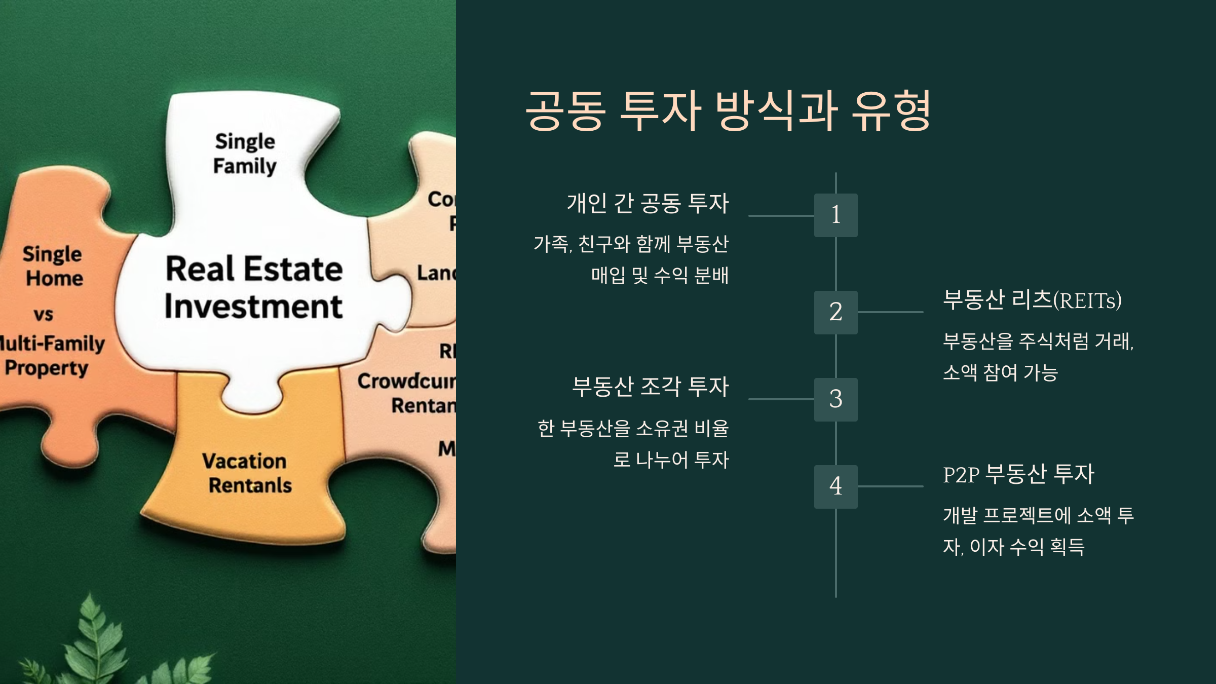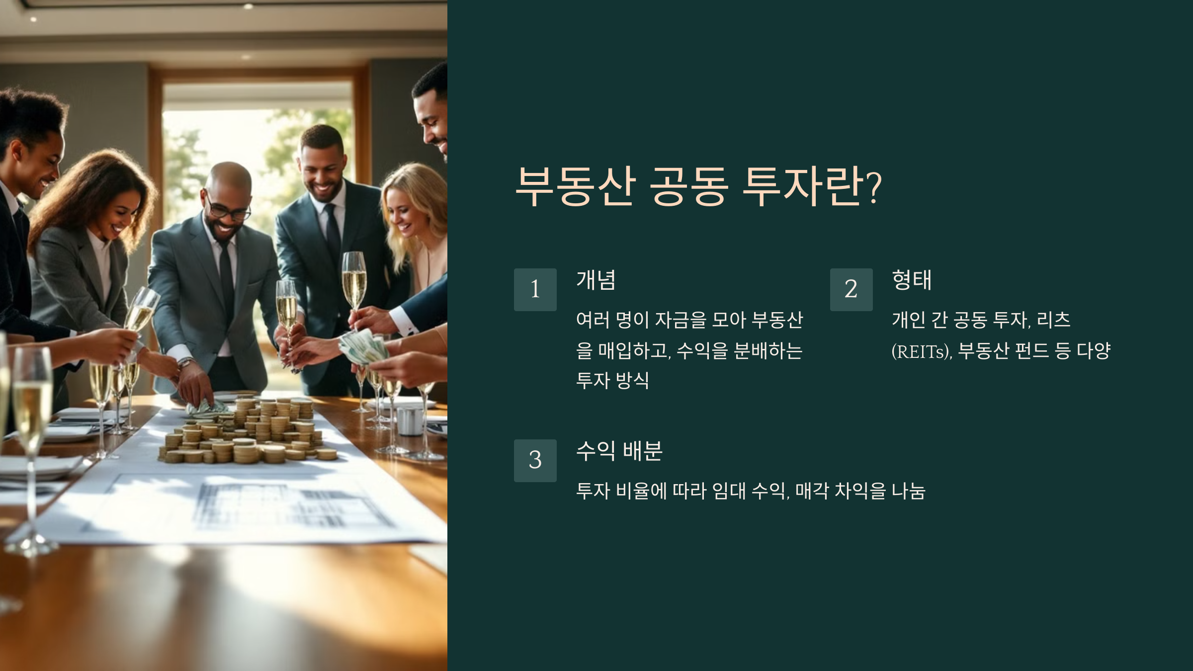 ✔ **개인 간 공동 투자:** 가족, 친구, 투자 모임 등과 함께 부동산을 매입하고, 수익을 나누는 방식이에요.