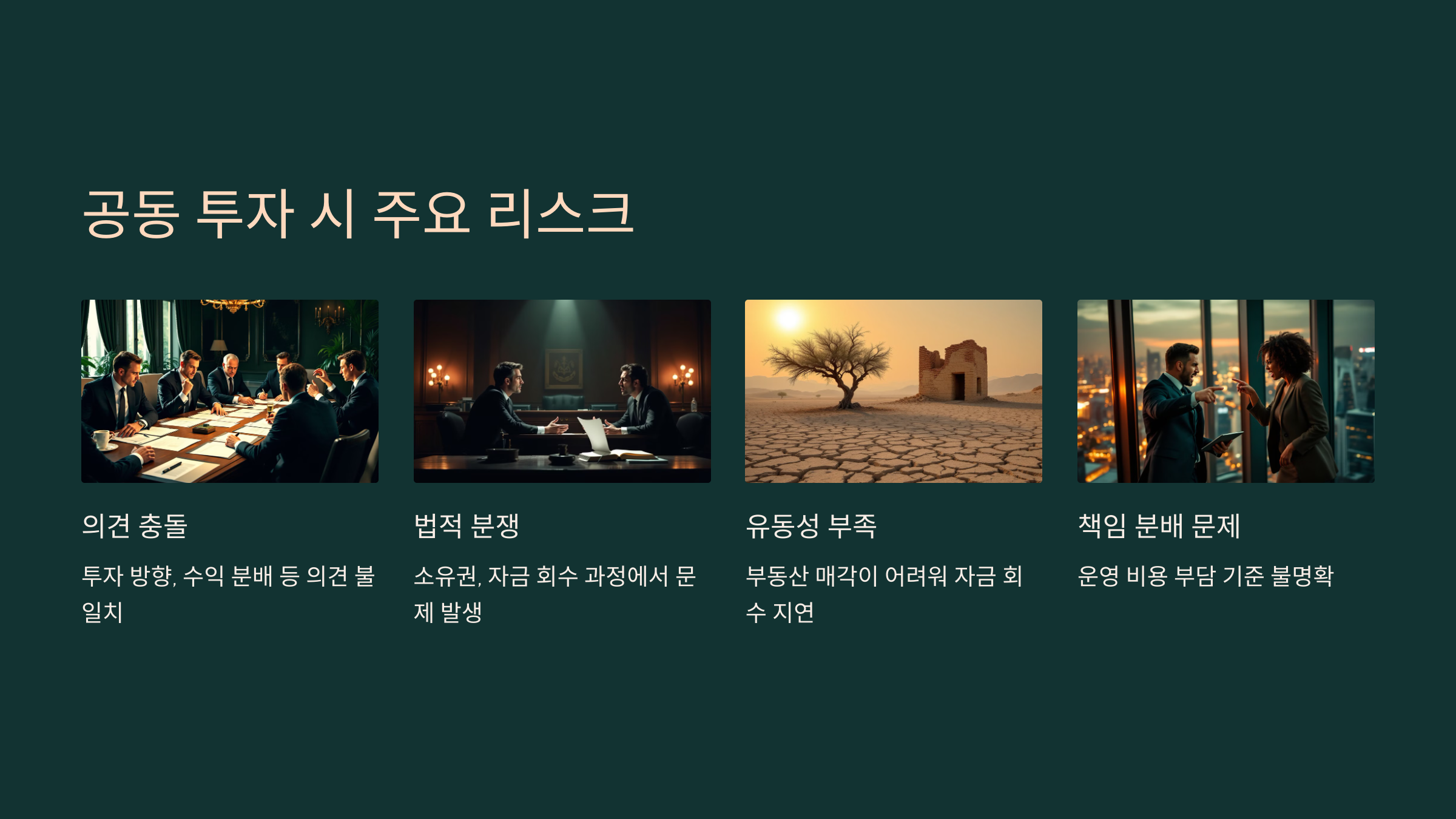 ✔ **의견 충돌:** 투자 방향, 수익 분배, 매각 시점 등에서 의견이 맞지 않으면 분쟁이 발생할 수 있어요.