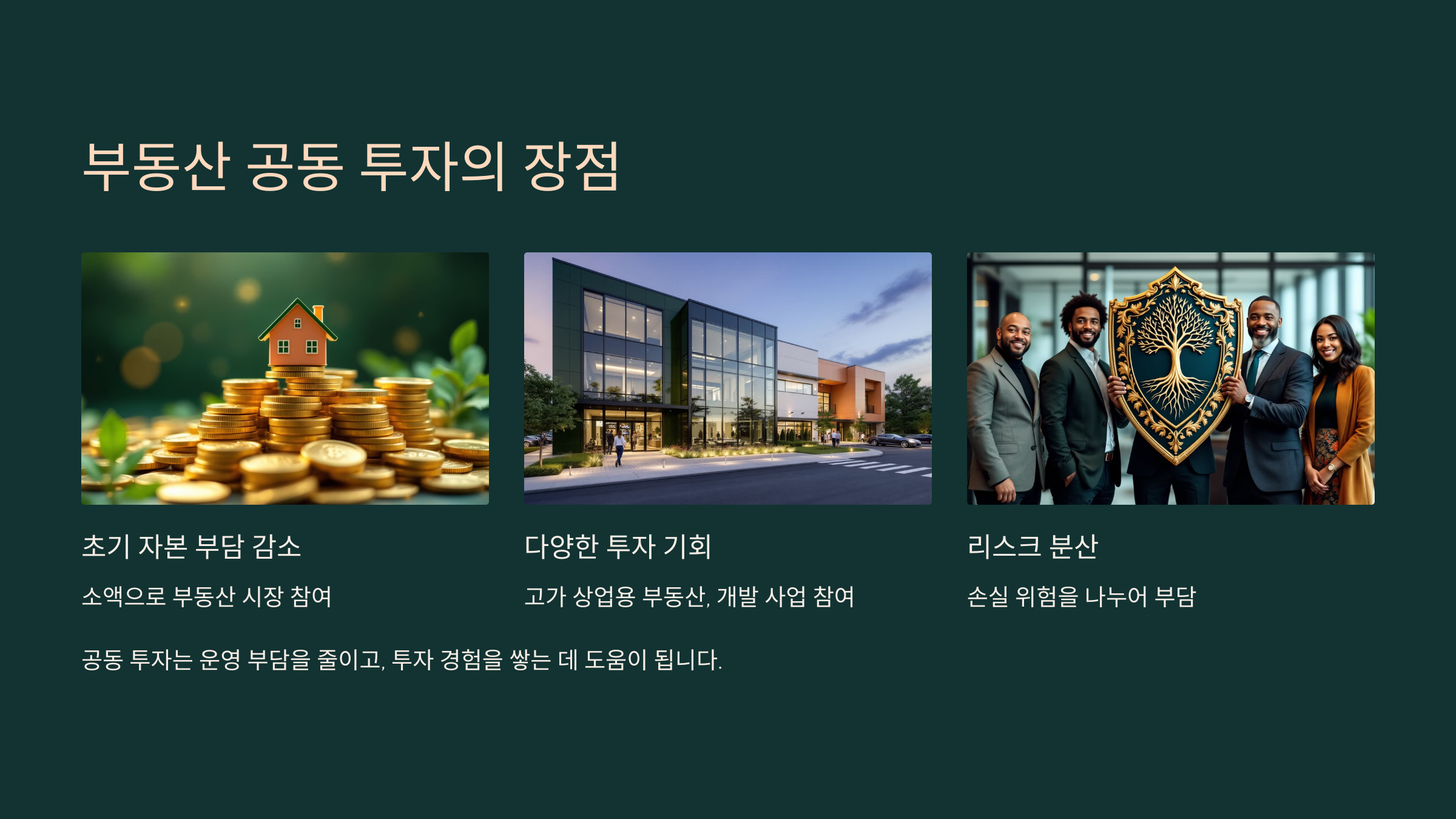 ✔ **운영 부담 감소:** 부동산 관리 및 운영을 공동으로 진행하기 때문에 개인 투자보다 부담이 적어요.