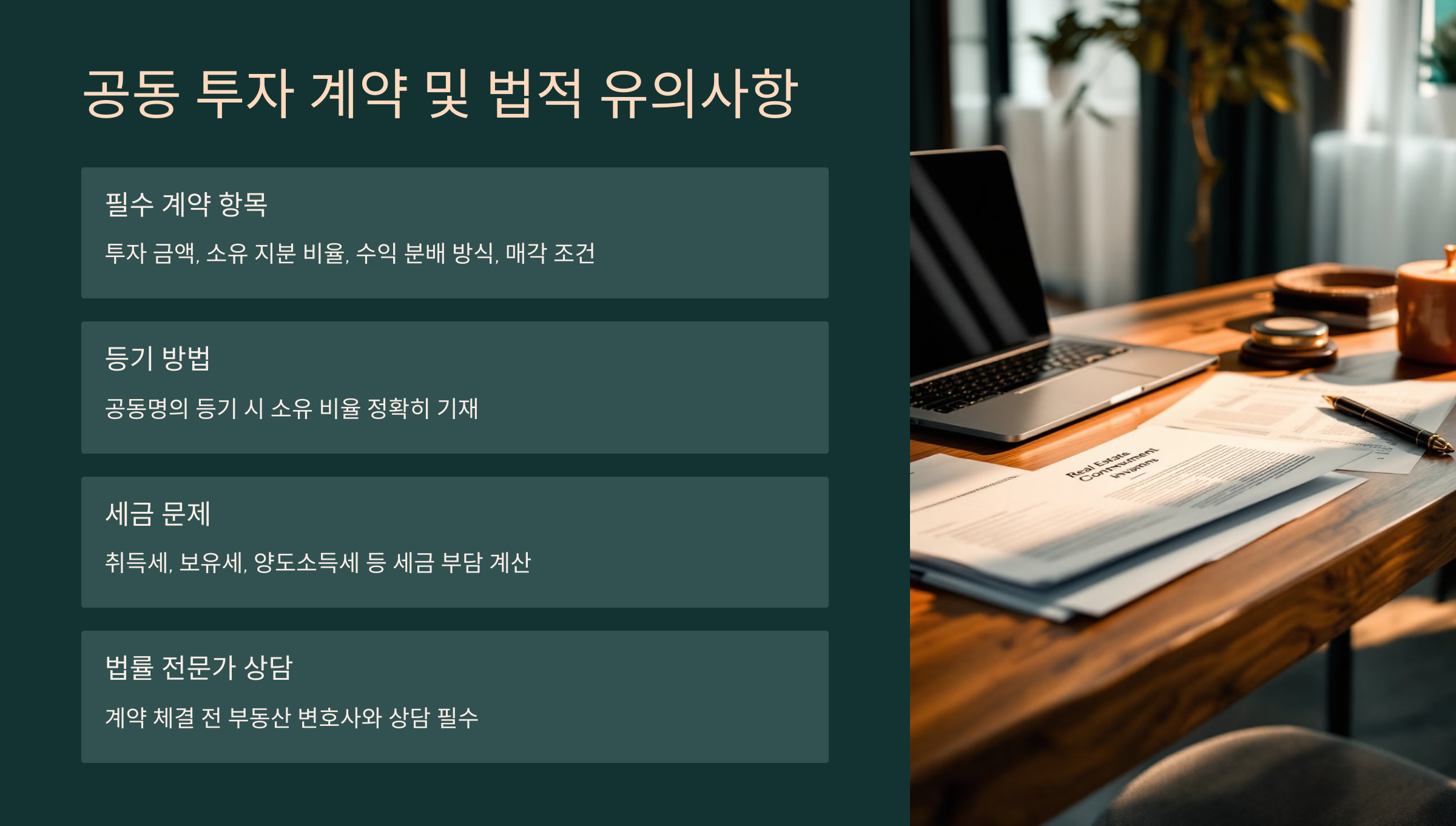 ✔ **공동 투자 계약서 필수 항목:** 투자 금액, 소유 지분 비율, 수익 및 비용 분배 방식, 매각 조건 등을 포함해야 해요.