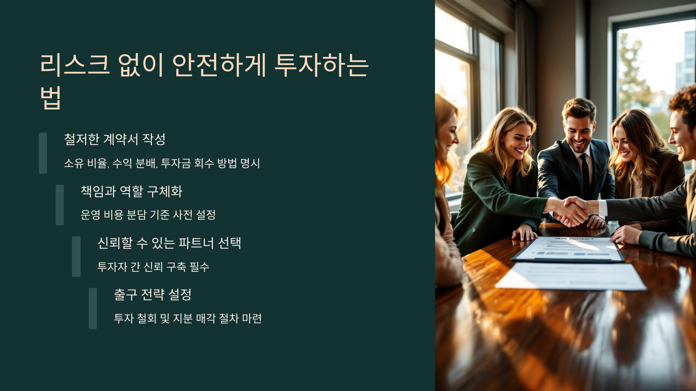 | 계약서 작성 | 투자 금액, 수익 배분, 매각 조건 등을 명확하게 기재 |