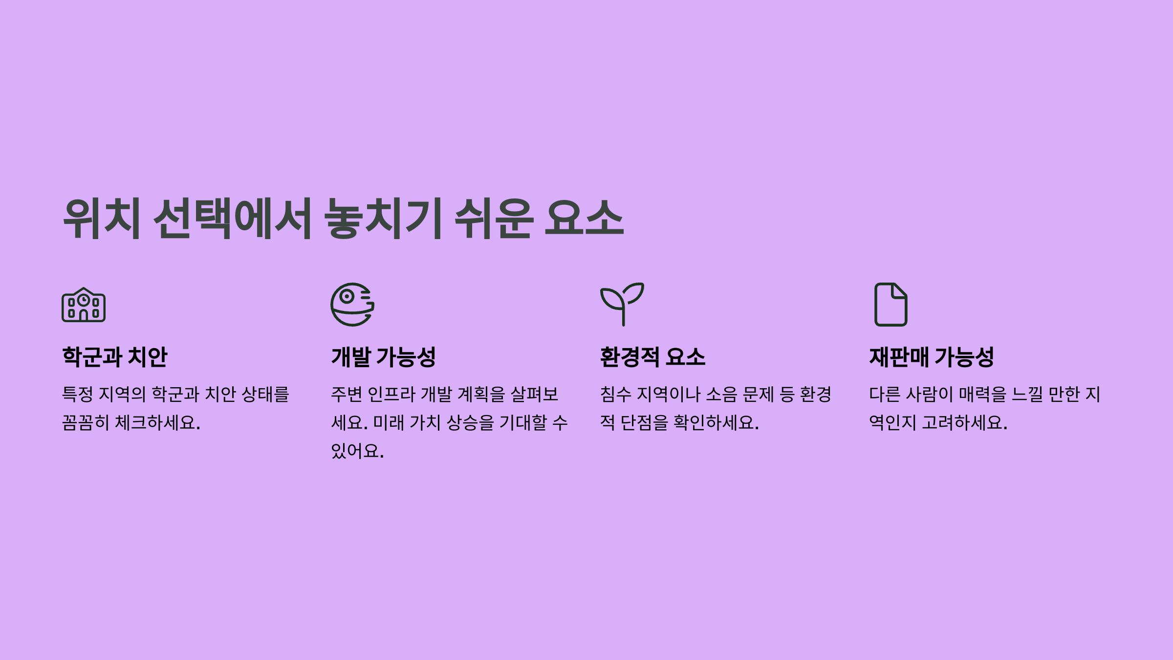 또한, 특정 위치가 가진 환경적인 단점도 놓치기 쉬운 부분이에요. 예를 들어, 침수 지역이나 소음이 심한 지역은 살기에 불편함을 줄 수 있어요. 이를 확인하려면 직접 해당 지역을 방문해 여러 시간대의 상황을 관찰하는 것이 좋아요.