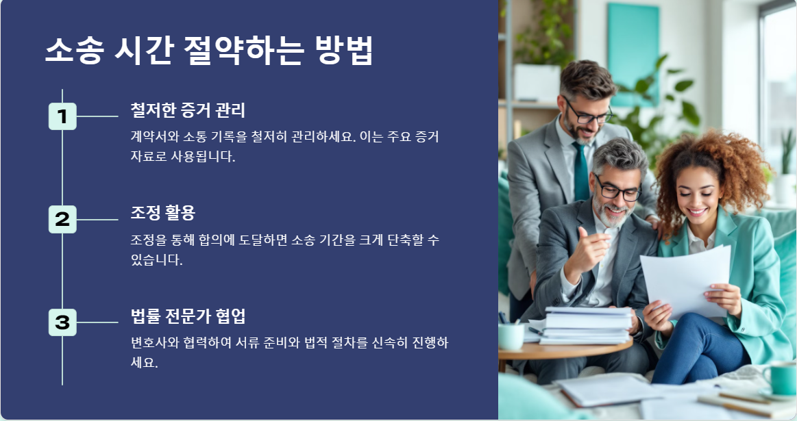 둘째, 조정을 적극적으로 활용하는 것도 좋은 방법이에요. 많은 경우 법원에서 판결을 내리기 전에 조정을 권유하는데, 이때 양측이 합의에 도달하면 소송 기간을 크게 단축할 수 있어요. 조정 과정에서 전문적인 변호사의 조언을 받으면 상대방을 설득하는 데 도움이 돼요.