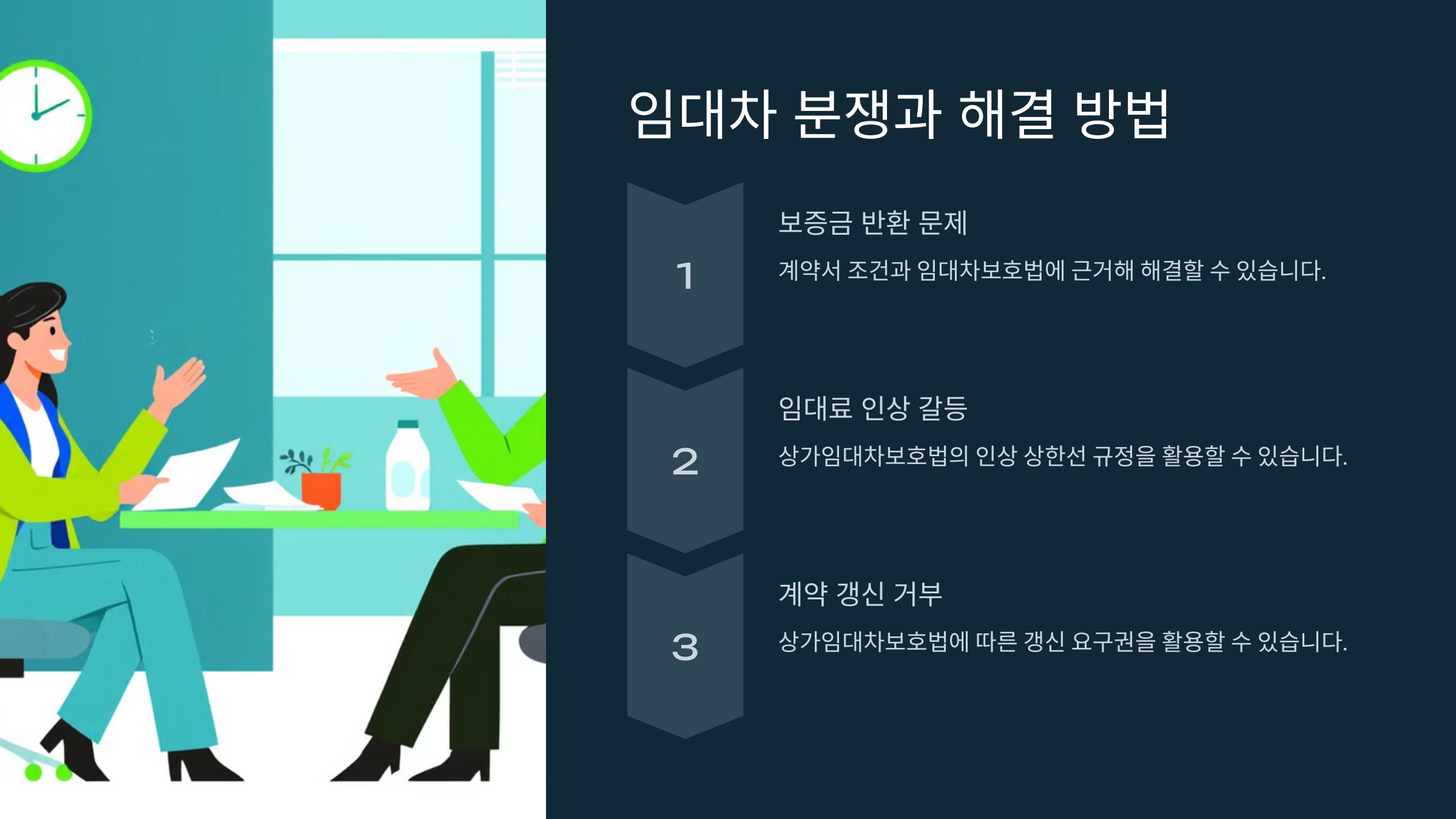 또 다른 문제는 임대료 인상과 관련된 갈등이에요. 상가임대차보호법에서는 일정 조건 하에서 임대료 인상의 상한선을 규정하고 있어요. 이를 통해 임차인은 과도한 임대료 인상을 막을 수 있답니다. 이런 제도를 잘 활용하면 분쟁을 예방하거나 효과적으로 대처할 수 있어요.