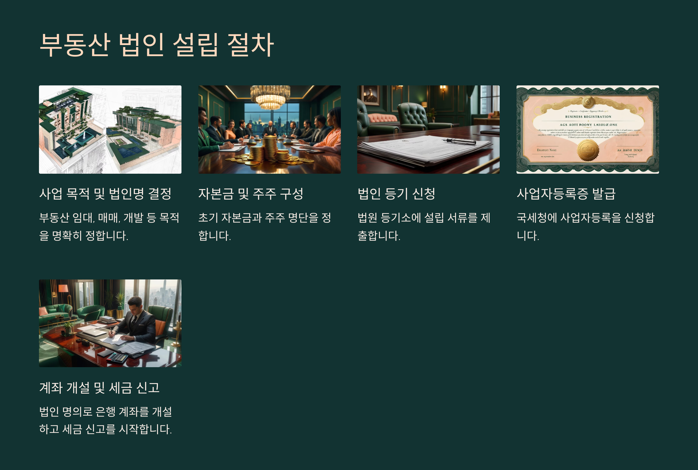 이처럼 부동산 법인은 세금 절약뿐 아니라 자산을 더 효율적으로 관리할 수 있어요. 다음으로는 **법인 설립 절차**를 자세히 알려드릴게요. 😊