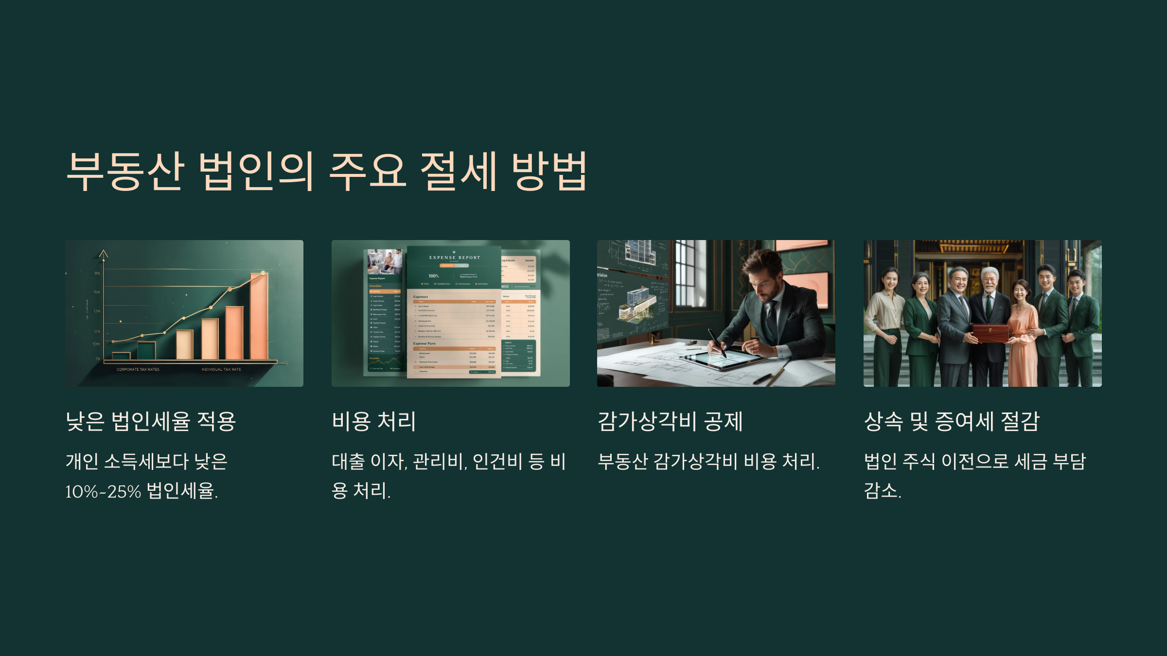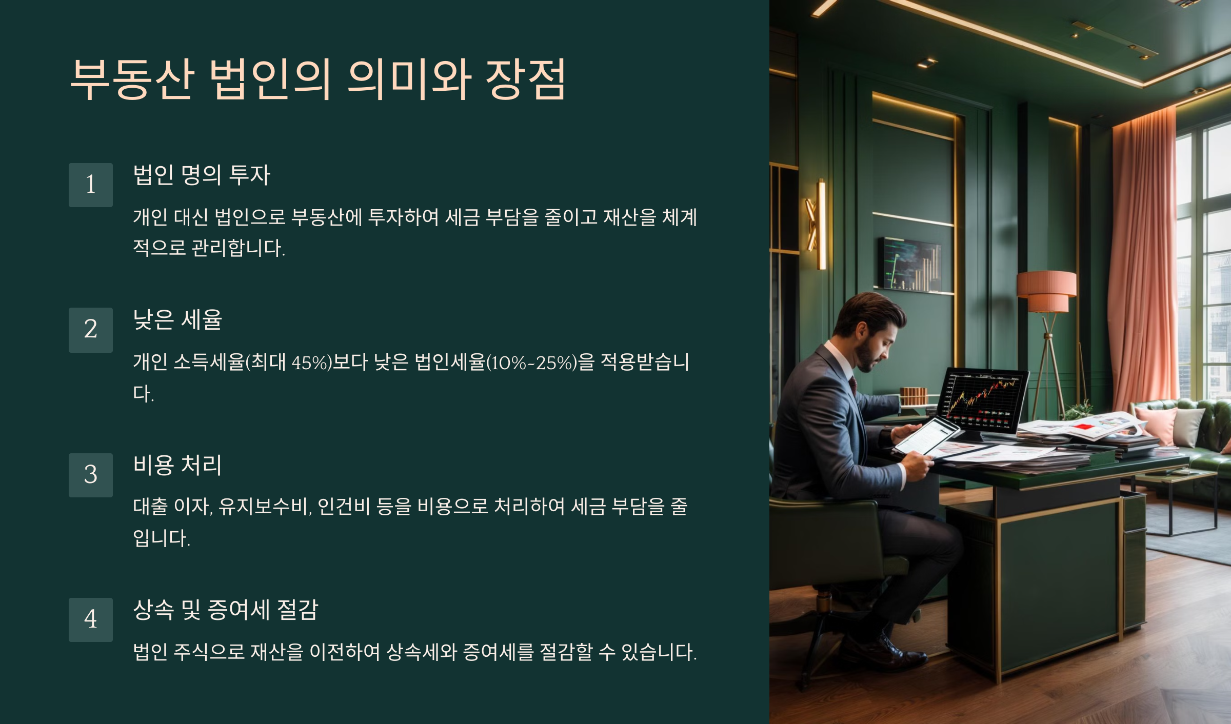 법인으로 부동산을 소유하면 **법인세율**을 적용받아 소득세보다 유리하고, 다양한 **세금 공제** 혜택도 누릴 수 있어요. 예를 들어, 임대 수익이나 양도소득세를 절세할 수 있고, 법인 비용 처리를 통해 소득을 합법적으로 조정할 수 있답니다. 😎