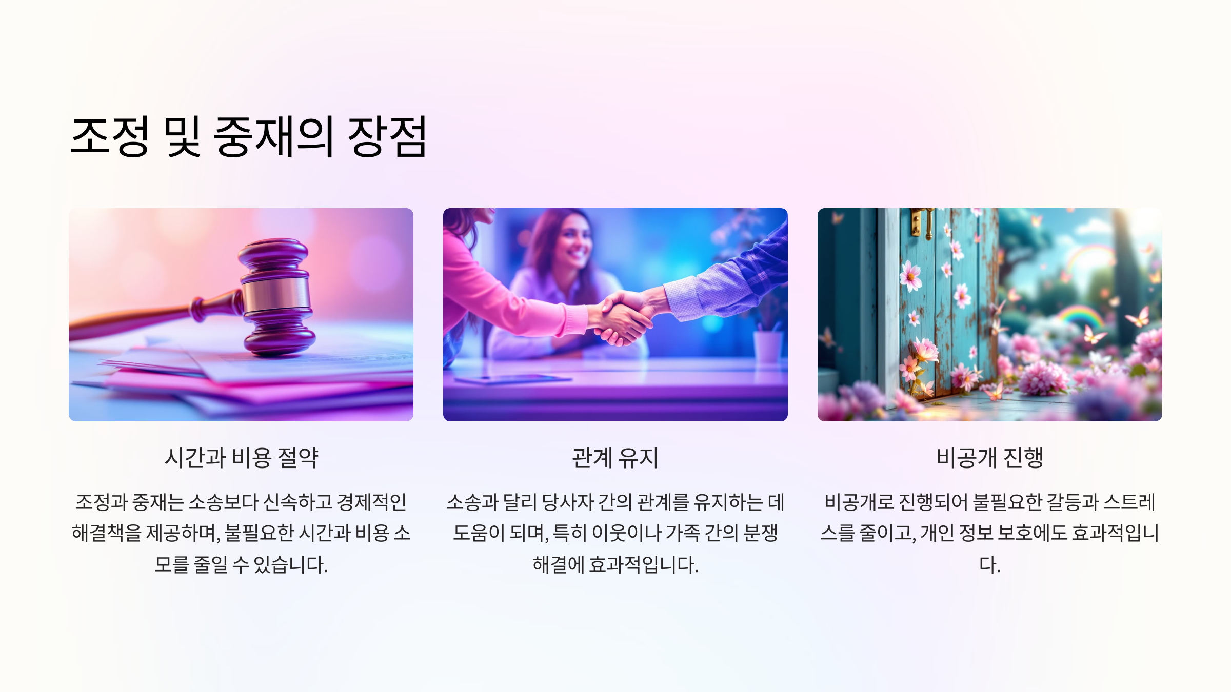 조정과 중재는 분쟁 당사자 간의 갈등을 최소화할 수 있는 큰 장점이 있어요. 특히 긴밀한 관계가 필요한 이웃이나 가족 간의 분쟁에서 조정이 효과적이에요. 합의가 이루어질 경우, 시간과 비용 모두 절약할 수 있어요.